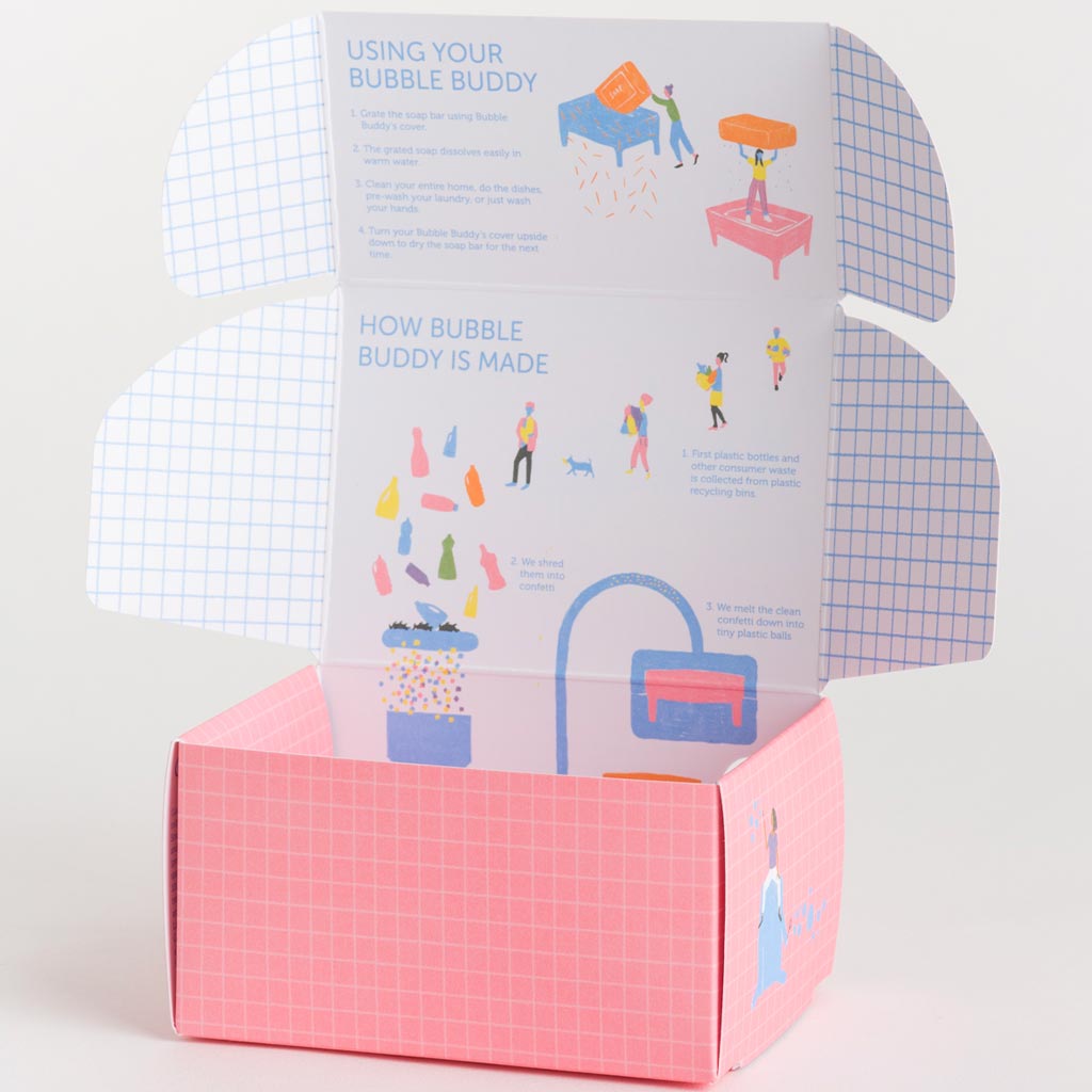 Pour tout vous expliquer, le kit standard Bubble Buddy comprend un porte-savon, mais également une barre de savon de nettoyage biologique aux multiples talents. L’un d’entre eux consiste à effriter la barre pour en faire un savon liquide pour nettoyer des surfaces. C'est l'accessoire idéal pour vos tâches ménagères, de la vaisselle aux sols, et il fonctionne même sur les pots les plus rebelles. Le petit plus, il est d’une douceur incroyable ! Mes mains me remercient à chaque fois !
