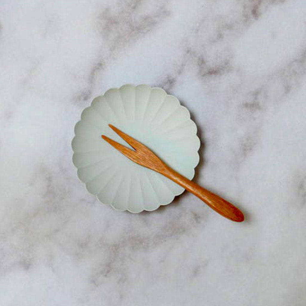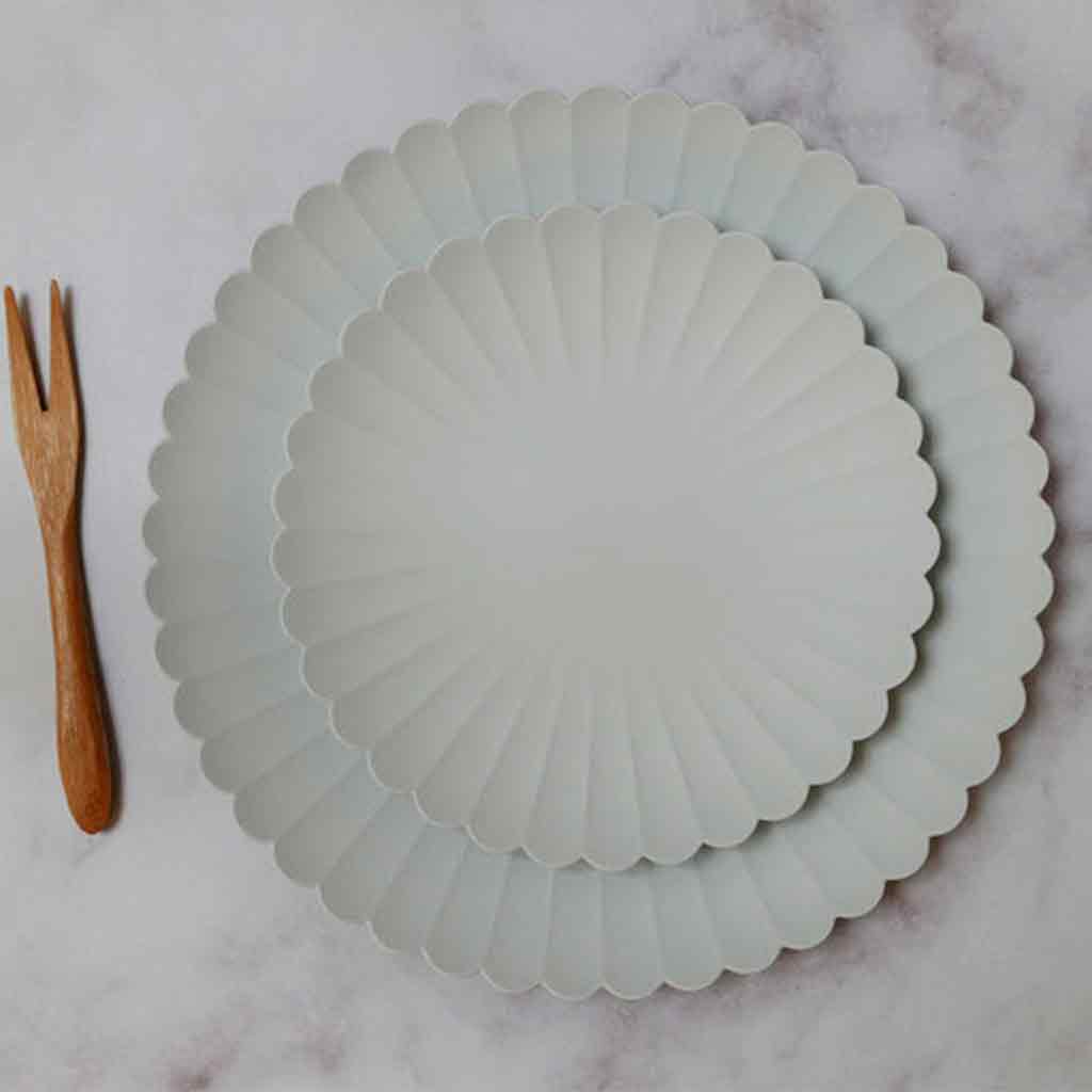 Bien qu’il s’inspire d’une conception ancestrale, Yanagihara ose une composition différente pour obtenir une argile à haute densité. Le résultat ? Des pièces robustes et très résistantes. Mais ce qui me plaît aussi beaucoup, c’est cette esthétique singulière. Inspiré de la grande floraison du chrysanthème, les assiettes de cette série sont un vrai élément décoratif avec leur fini gris clair mat, dont je suis complètement fan.