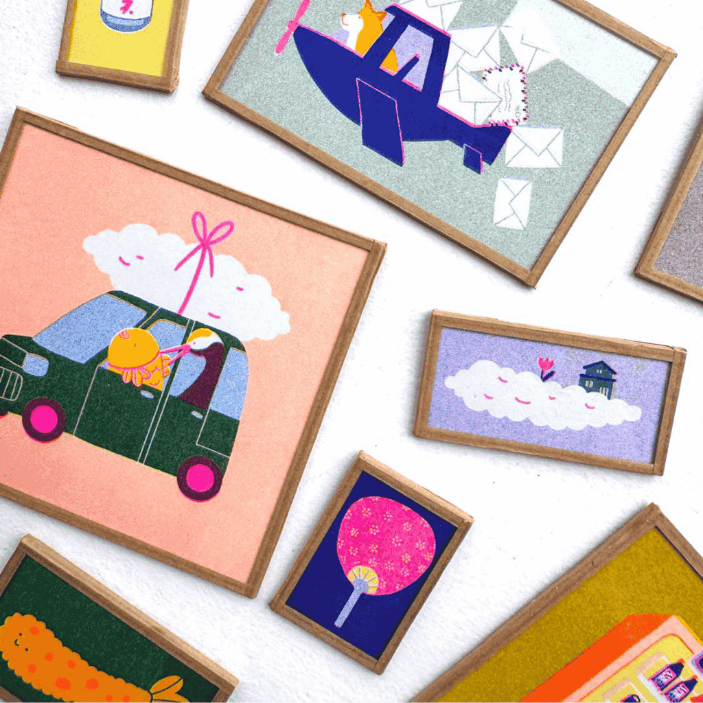 Elle a ce don rare de saisir la poésie des petites choses. Chez elle, une boîte à bento, un nuage ou un ticket de métro deviennent des images sensibles, douces et graphiques. C’est un style qui fait écho à l’ADN de Kumo, à notre manière de regarder les objets du quotidien avec curiosité et émotion. D’ailleurs, les risographies sont imprimées dans l’atelier Quatre par Trois selon un processus artisanal où les couches de couleurs s’assemblent en légères irrégularités, ce qui rend chaque exemplaire unique.