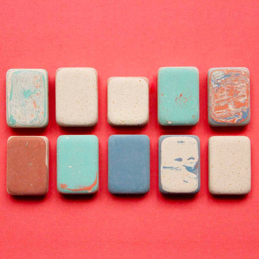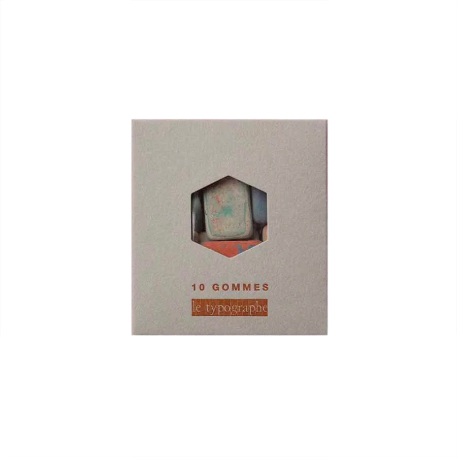 Découvrez ce lot de 10 mini gommes de la marque belge Le Typographe. Avec ce paquet, gommez et recommencez à l'infini ! Ces petites gommes ressemblant à de petits galets réussiront à embellir votre bureau.