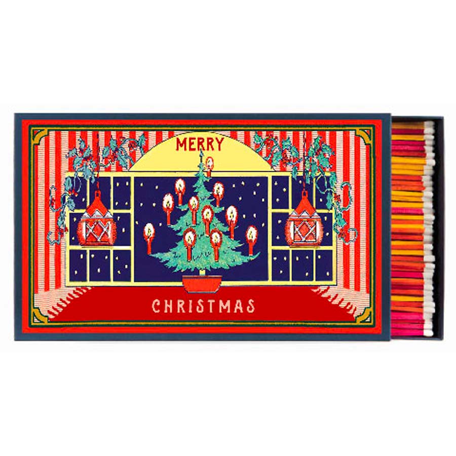 La boite d'allumette maxi Christmas window. Cette boite d'allumette surdimensionnée vous fera plonger dans la magie de Noël. Fabriquée et imaginée au Royaume-Uni, cette maxi boîte rectangulaire comprend 150 allumettes colorées de 28 cm entièrement faites de bois de peuplier naturel.