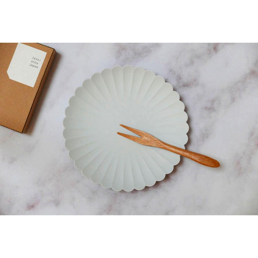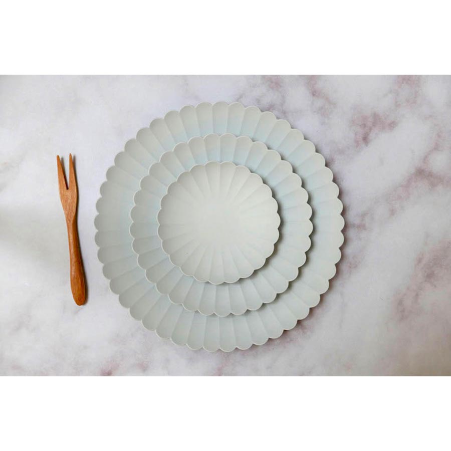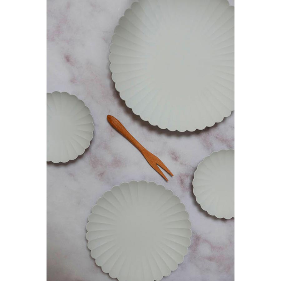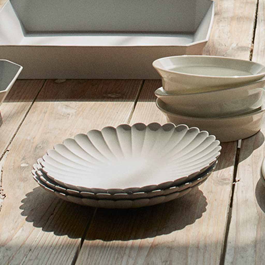 L'assiette TY Palace en porcelaine en forme de chrysanthème, taille M, couleur blanc/gris, de la marque japonaise 1616 Arita. L'assiette ressemble à une grande fleur. Cette série d'assiettes TY palace a été conçue lorsque 1616 Arita a ouvert son magasin au « Palace Hotel Tokyo » créé en 1961. L'hôtel représente l'un des prestigieux hôtels japonais. Le design a été inspiré par la grande floraison du chrysanthème.