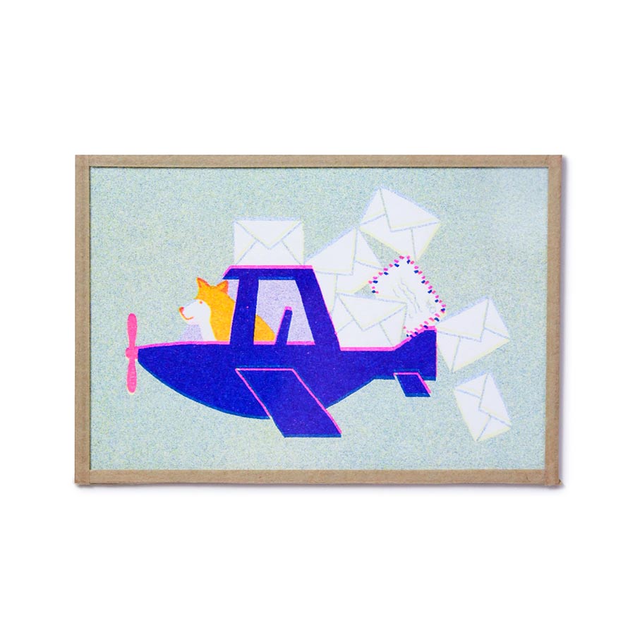 Sous le trait poétique de Knapfla, ce souvenir se transforme en une scène joyeuse et légère : un shiba, chien emblématique du Japon, pilote un petit avion d’où s’échappent des lettres portées par le vent. Le dessin mêle tendresse et espièglerie, dans une palette lumineuse vert d’eau, bleu profond, rose néon et orange, évoquant à la fois le ciel d’été et la chaleur d’un lien familial.