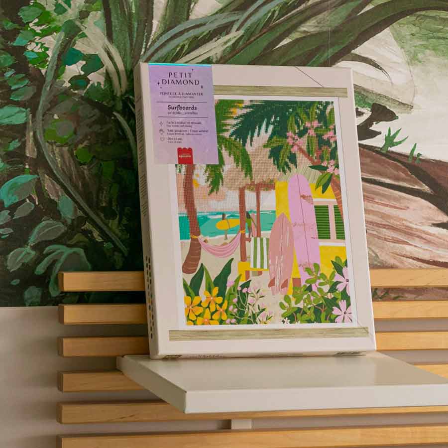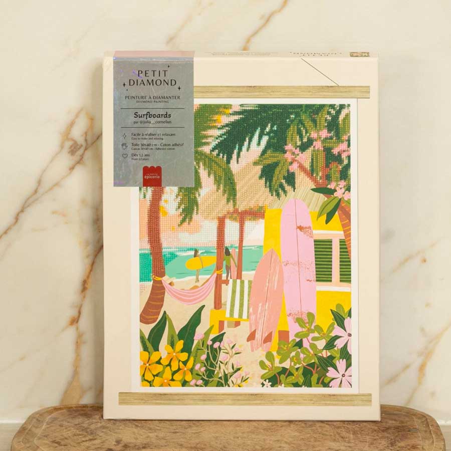 Le Coffret Petit Diamond Surfboards de La Petite Épicerie est un hommage aux plages paradisiaques et à l'esprit libre du surf. Cette illustration captivante représente une paillote de plage, un hamac invitant à la détente, et des planches de surf prêtes à s’élancer sur des vagues scintillantes. Le tout se déroule sous un ciel d’un bleu azur, capturant l’essence d’un été vibrant et l’adrénaline des sports nautiques. Ce tableau animé et lumineux, une fois complété, apportera une touche estivale et joyeuse à votre décoration intérieure, vous permettant de prolonger l’esprit de l’aventure et de l’évasion.