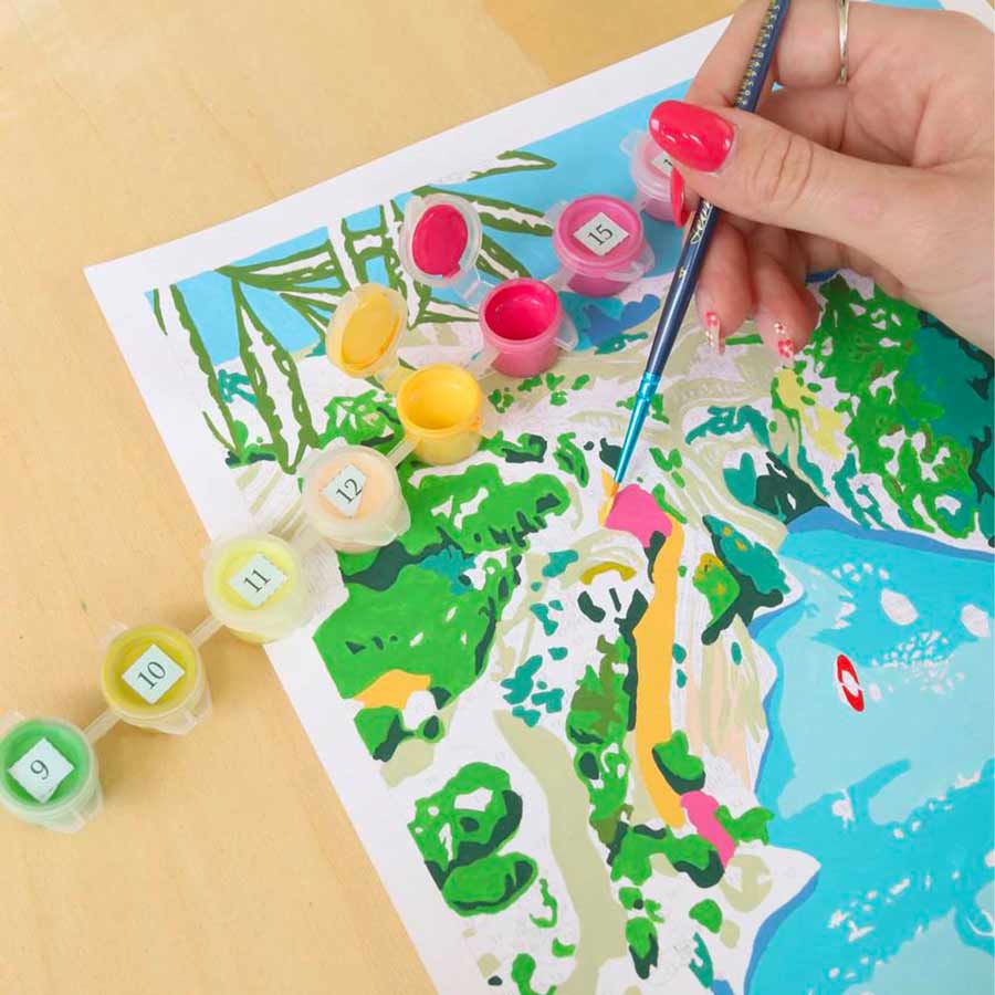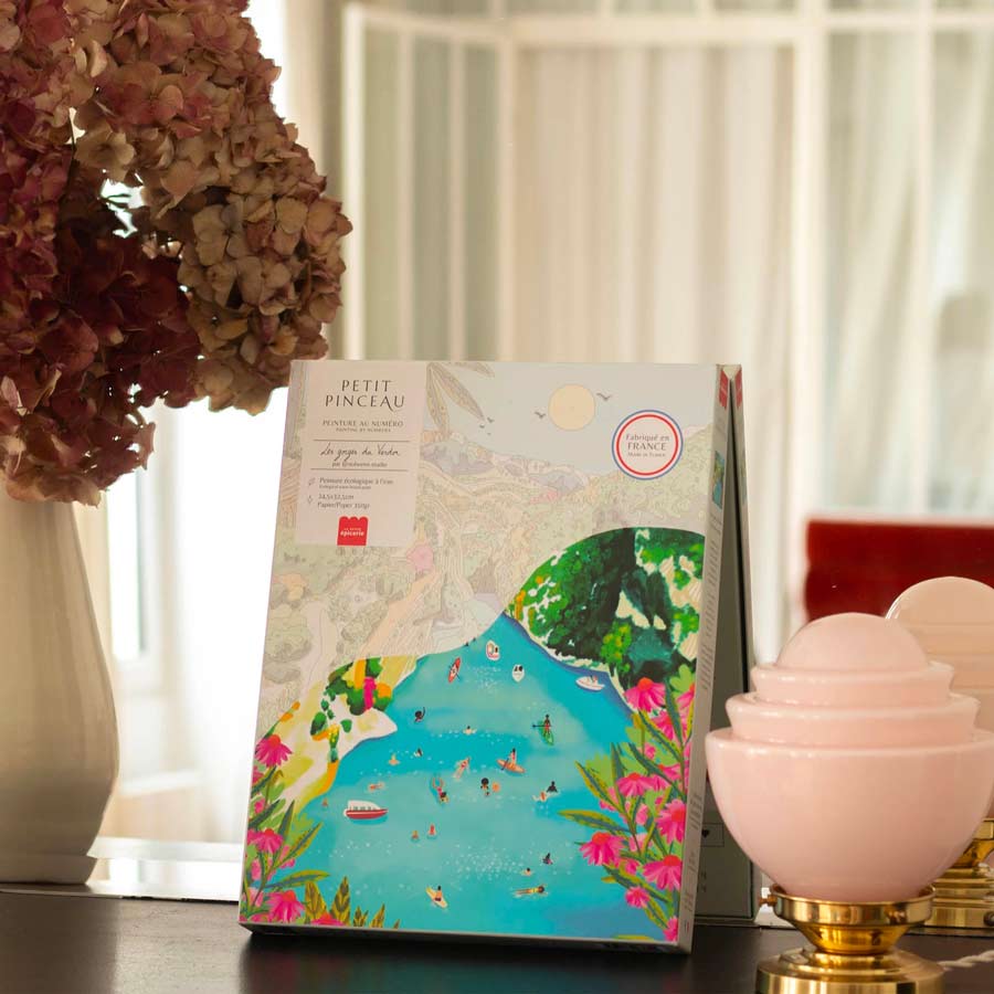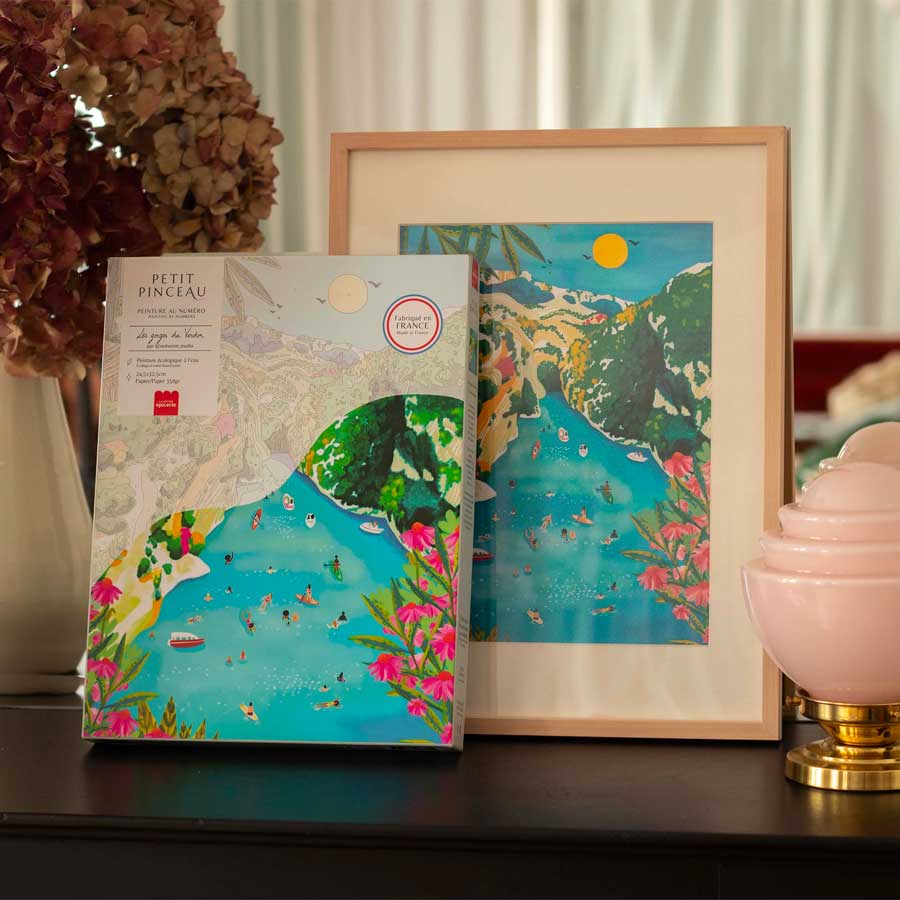 Le kit de peinture au numéro Les Gorges du Verdon est né de la collaboration entre Nolwenn Studio et La petite épicerie. Ce set de peinture à faire soi-même est composé d'une illustration numérotée, de pots de peintures et de deux pinceaux.