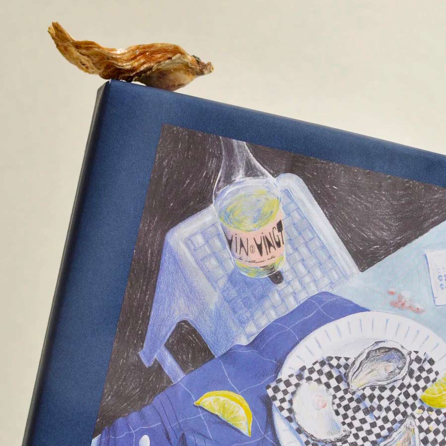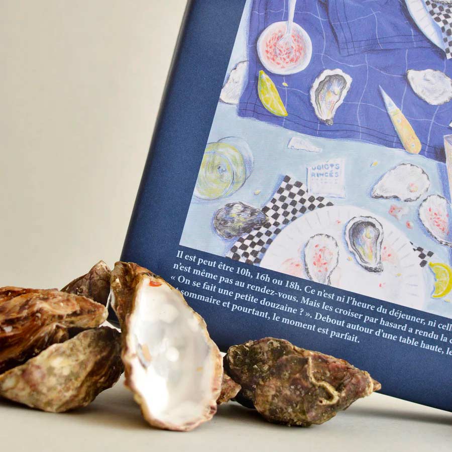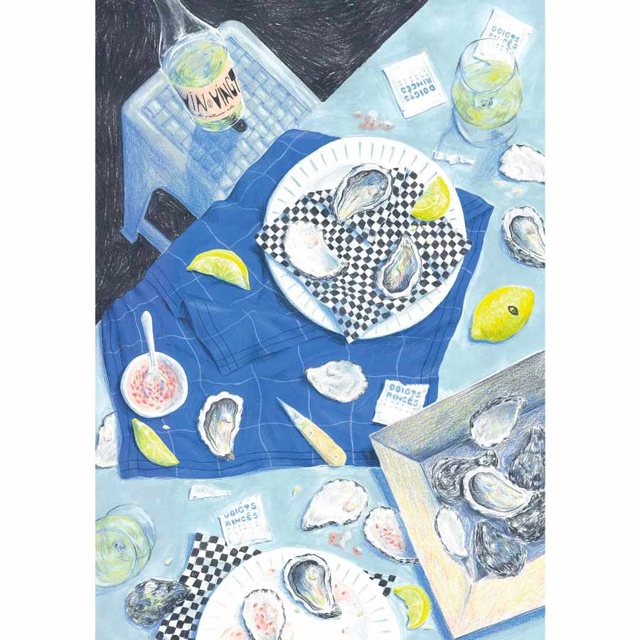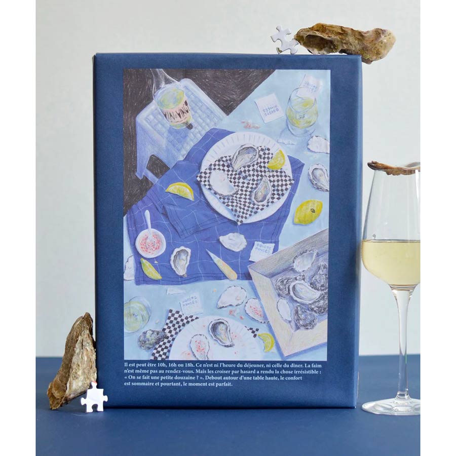 Une illustration colorée et détaillée représentant une dégustation d'huitres dans les tons bleus. Évadez-vous le temps d'une dégustation d'huitres l'été au Cap Ferret. Ce puzzle vous remémore les bons moments partagés entre amis au Mimbeau. Les enfants jouant dans le sable, chassant les crabes dans la conche, pendant que les adultes savourent de délicieuses huitres du bassin d'Arcachon. Ces bons moments existent aussi dans d'autres merveilleux endroits de la France ou on a plaisir à déguster des huitres telle que la Normandie.