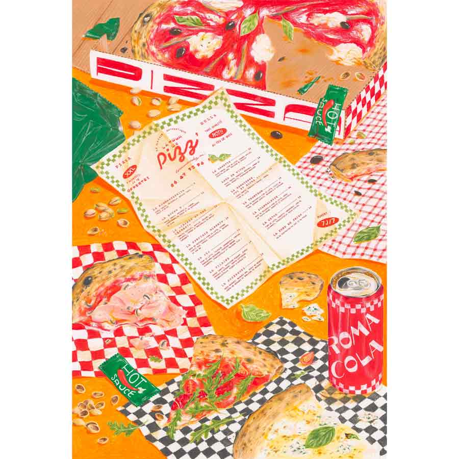 L'illustration nous montre une table sur laquelle au centre, une carte de menu d'une pizzeria est disposée. On retrouve notamment une boîte à pizza avec autour plusieurs détails délicieux : une part de pizza posée sur un mouchoir à carreaux blanc et rouge, des pistaches, des olives, de la sauce piquante et une canette de soda. Tout est présent pour recréer l'ambiance d'un repas décontracté.