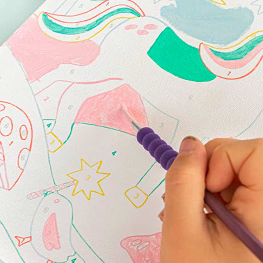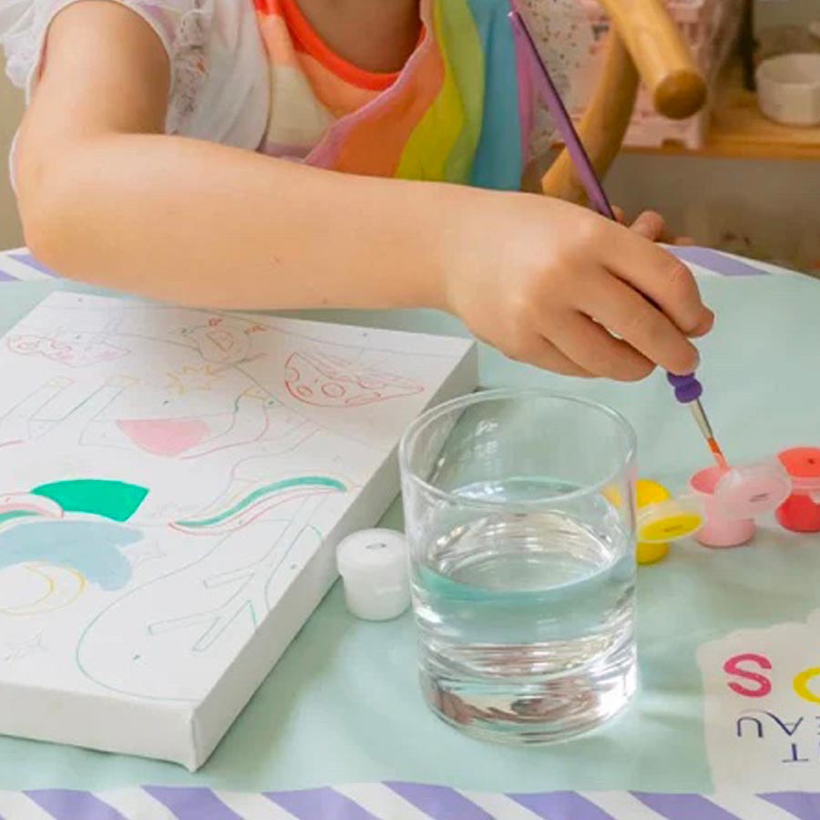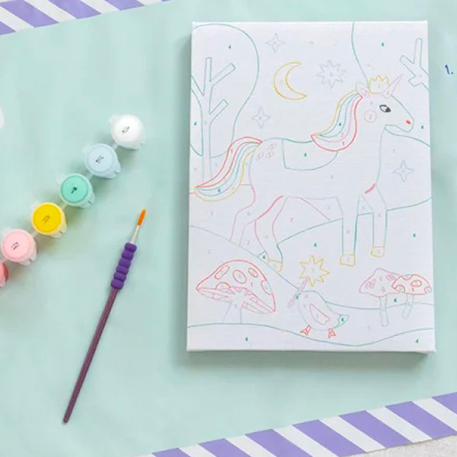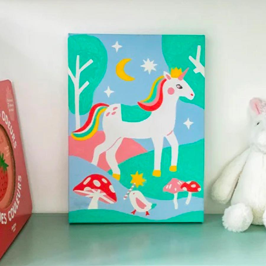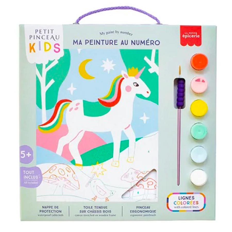 Le kit de peinture au numéro pour enfants Licorne et Piou de La Petite Épicerie. Ce set de peinture à faire soi-même est composé d'une toile numérotée, de pots de peintures et d'un pinceau ergonomique.