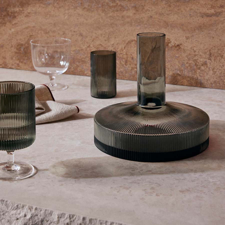 La carafe à vin gris fumé de la collection Ripple de chez Ferm Living. Souflée à la bouche, est fabriqué dans un verre fin et résistant. Cette carafe arbore les cannelures typiques de cette collection. Chaque flacon est soufflé à la bouche ce qui rend chaque pièce unique.