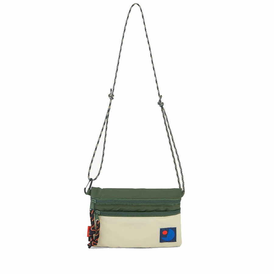 Une jolie pochette à bandoulière couleur vert kaki, beige avec une sangle en corde marron clair chiné de la marque Japfac. Ce petit sac se compose de deux pochettes zippées, pour y glisser vos accessoires du quotidien : portefeuille, bloc-notes, stylos, smartphone, etc. On retrouve le logo à l'avant de la pochette. La sangle en corde est réglable.