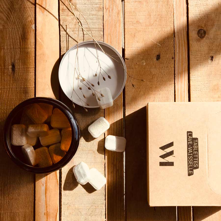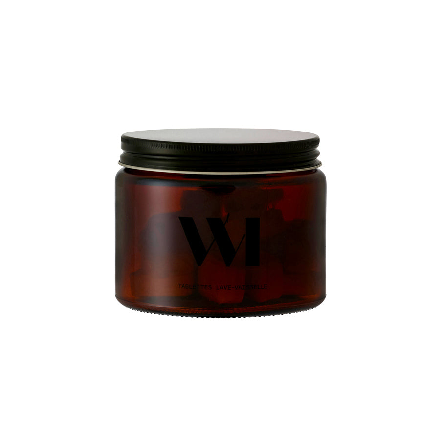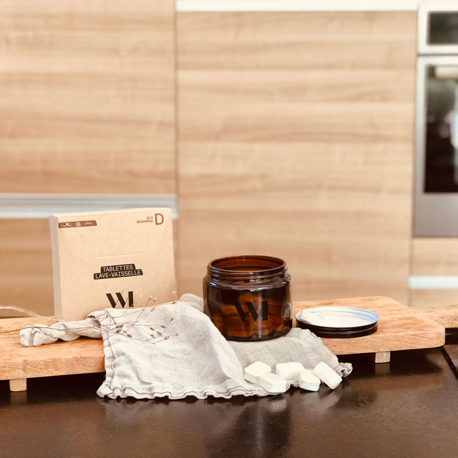 Les pastilles sont rangées dans un joli pot en verre que vous pourrez recharger à l'infini avec les paquets de 30 recharges de pastilles lave-vaisselle.
