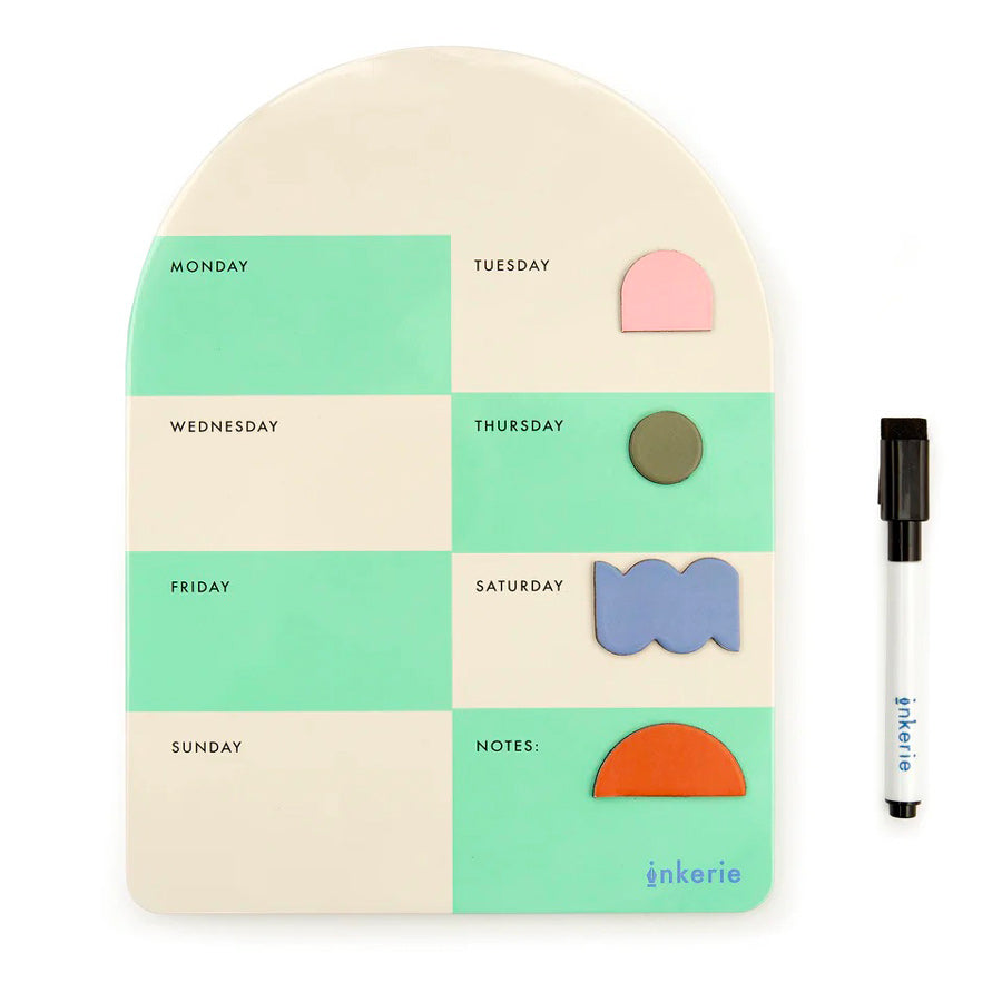 Le tableau magnétique quadrillé vert et beige de chez Kikkerland. Ce pense-bête en forme d'arche vous permettra de noter toutes les choses importantes du quotidien. Divisé en jour de la semaine, il vous aidera à organiser vos semaines et à ne rien oublier : la liste de course, la to do list, les rendez-vous. Cette ardoise effaçable vous simplifiera la vie et diminuera votre charge mentale.