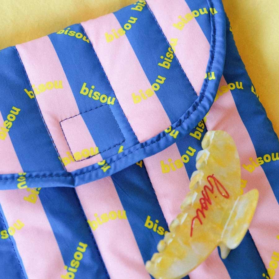 Cette housse rayée rose et bleu signée Mathilde Cabanas coche toutes les cases : fun, pratique, bien rembourrée, et surtout… impossible à louper.