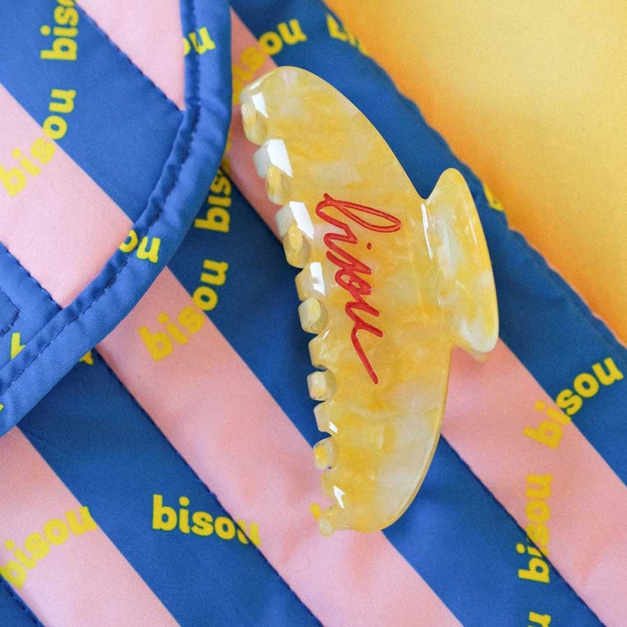 Avec son motif "bisou" imprimé en jaune fluo sur fond graphique, elle apporte la dose de bonne humeur qu’on aime bien glisser dans son sac. Parfaite pour bosser sans trop se prendre au sérieux.