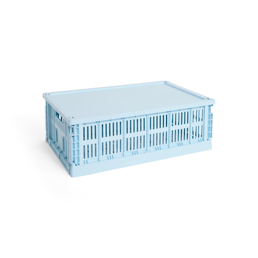 Le couvercle de cagette L de HAY vient compléter les cagettes grand format avec une touche lumineuse. En bleu ciel, il apporte de la légèreté au rangement tout en conservant une esthétique graphique.