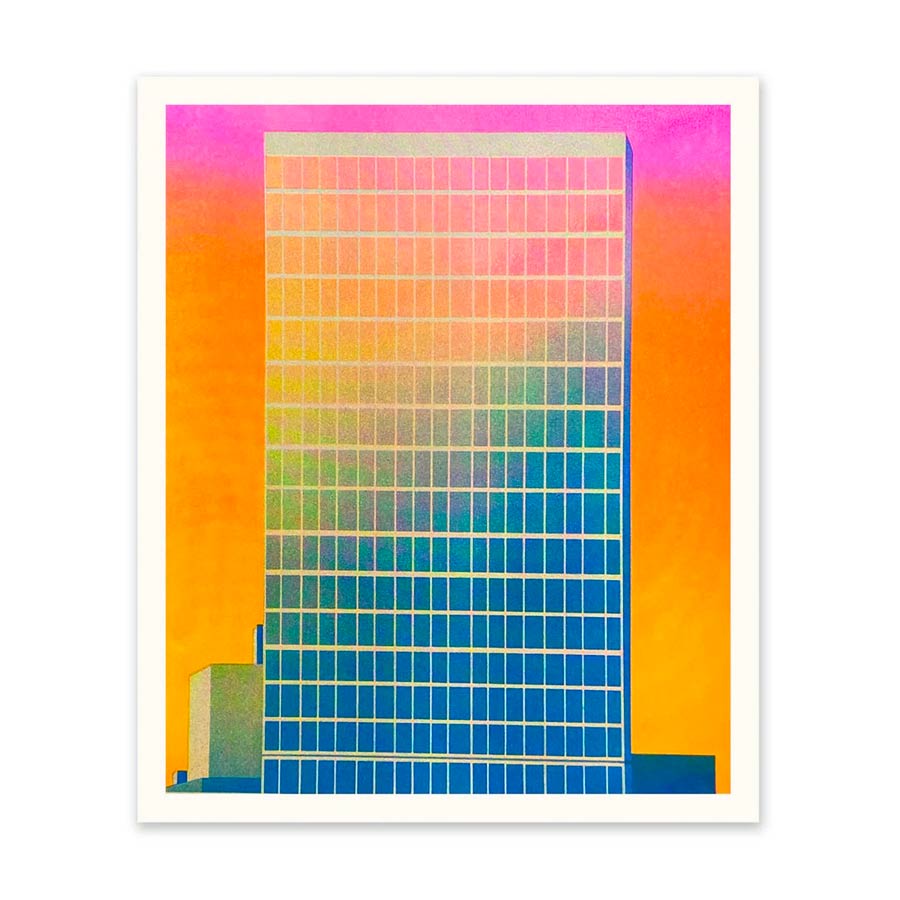 Un gratte-ciel aux lignes impeccables qui se détache sur un ciel saturé de couleurs : orange, rose fluo, reflets irisés... Ce bâtiment imposant, presque hypnotique, devient ici une icône graphique.