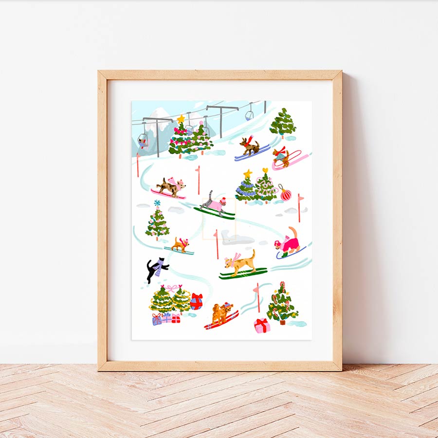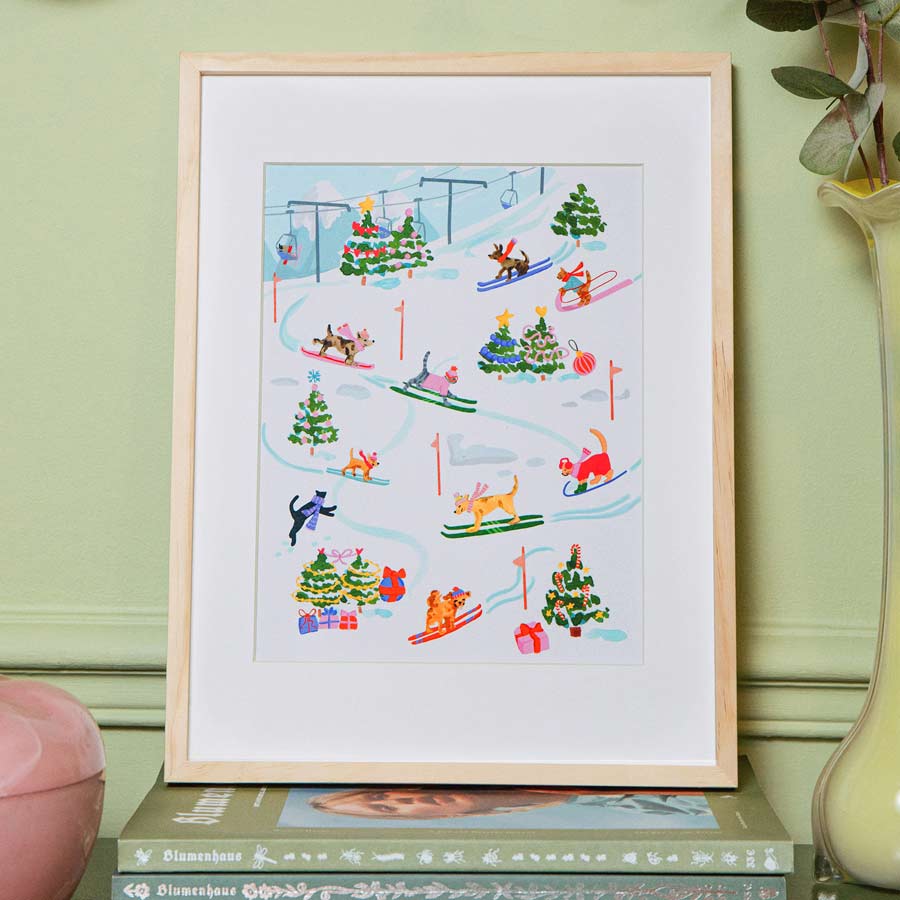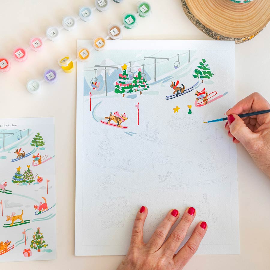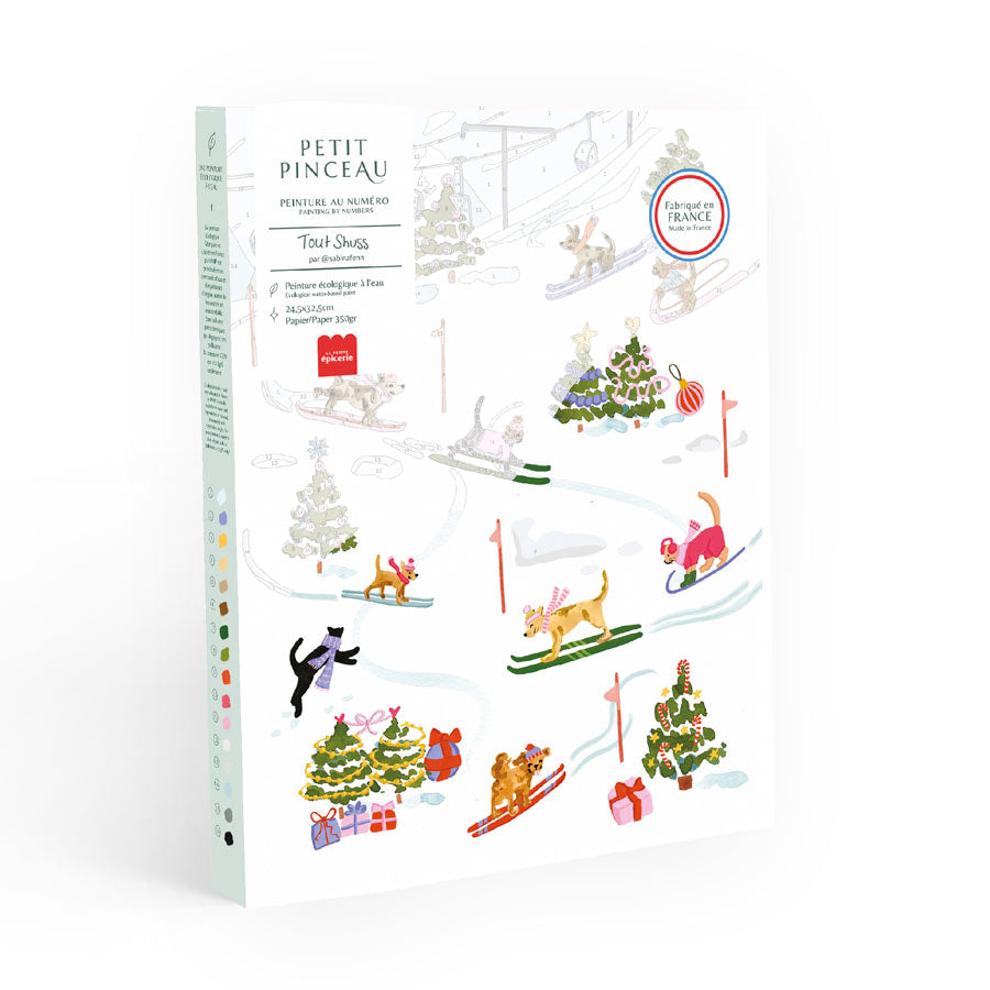 Avec le kit peinture au numéro Tout Schuss, La Petite Épicerie propose une scène hivernale pleine de pep’s : chiens skieurs, sapins décorés et montagnes enneigées… l’ambiance des sports d’hiver en version joyeuse et colorée !