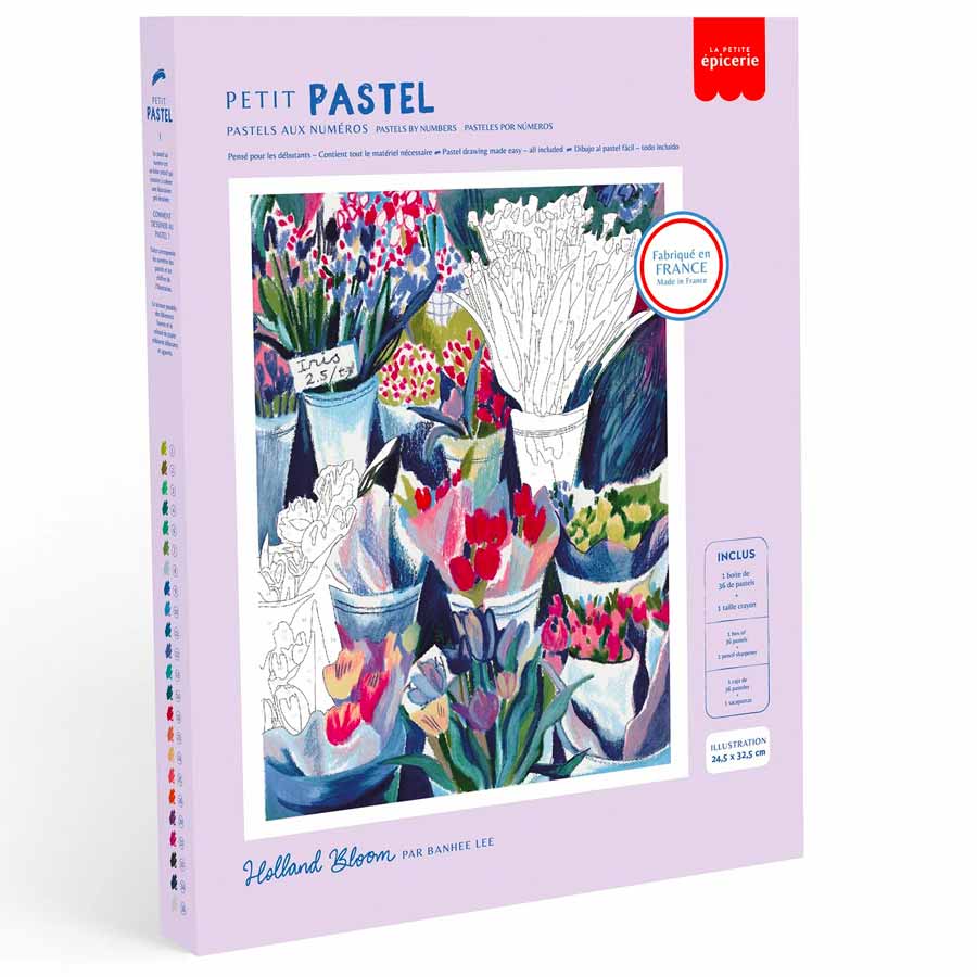 Le visuel met en scène des bouquets de fleurs, avec des tulipes bien graphiques et des aplats de couleurs qui rendent le pastel au numéro particulièrement satisfaisant à réaliser.