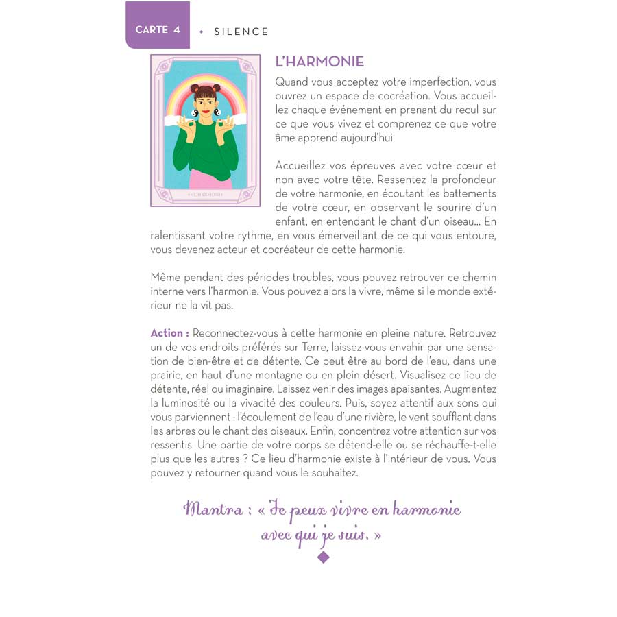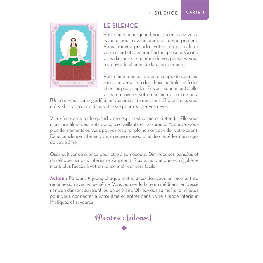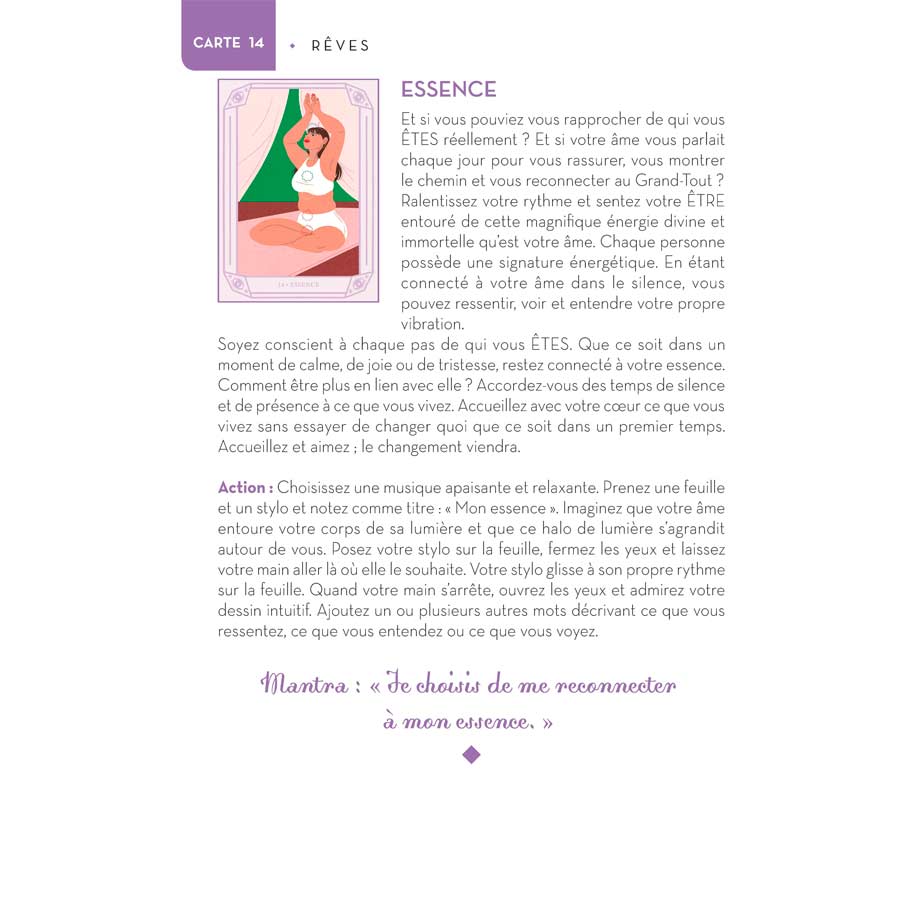 Cet oracle vous guide dans une quête spirituelle personnelle, offrant des réponses intuitives et des conseils pour vous aligner avec votre essence. Chaque carte délivre un message, accompagné d'une action et d'un mantra, pour vous aider à mieux comprendre vos émotions et vos aspirations profondes.