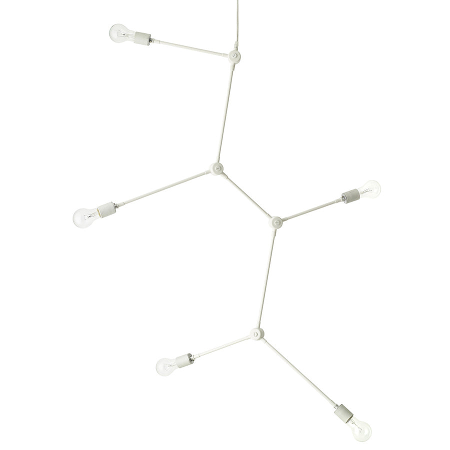 Inspirée du New York Glamour des années 1930 et issue de la collection Tribeca de chez Menu, cette suspension est confectionnée à partir d'objet de récupération. Les pièces en acier revêtu par poudre forment un luminaire asymétrique composé de cinq lampes. Un design industriel qui allie à la fois modernité et élégance.