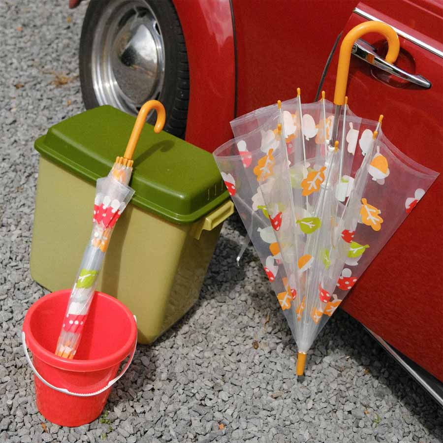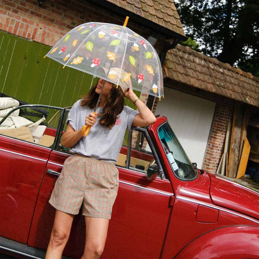 Avec ses motifs d’automne : feuilles, champignons et noisettes, ce modèle signé Mathilde Cabanas apporte une touche fun aux journées pluvieuses. Sa forme cloche protège bien tout en gardant une bonne visibilité grâce au plastique transparent. Et évidemment, on retrouve le sens du détail propre à la marque : design français et poignée jaune en clin d’œil.