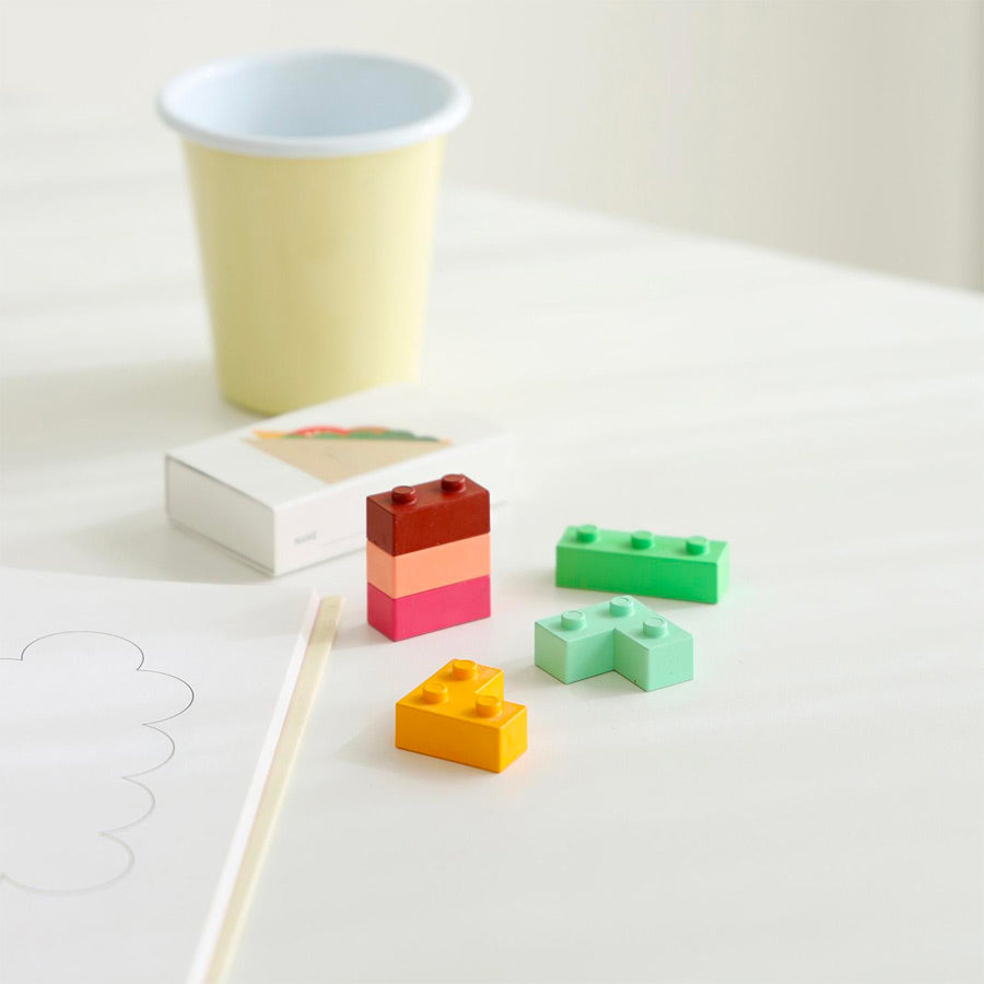 Comme les autres Crayon Block, ce set comprend six blocs de cire, répartis en trois formes différentes. Ils s’assemblent et s’empilent comme un puzzle, permettant d’appliquer plusieurs couleurs en un seul geste et de créer des effets uniques à chaque tracé. Un objet créatif hybride, entre crayon, jeu et outil d’expérimentation. La cire est ferme, résistante et très couvrante. Elle glisse facilement sur le papier, s’use lentement et conserve sa forme.