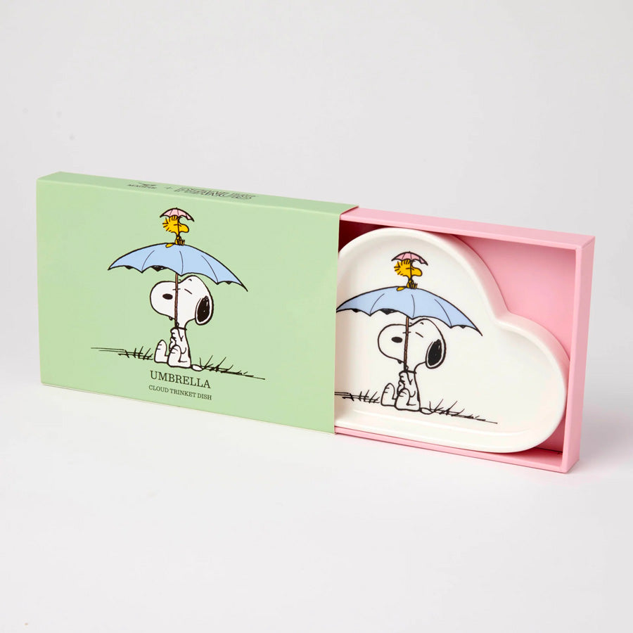 Ce vide-poche en forme de nuage présente Snoopy sous la pluie, dans une scène douce et poétique.
