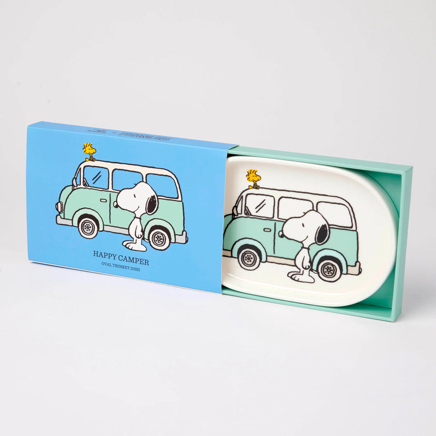 Ce vide-poche ovale Magpie montre Snoopy en escapade camping, dans un esprit vintage et relax.
