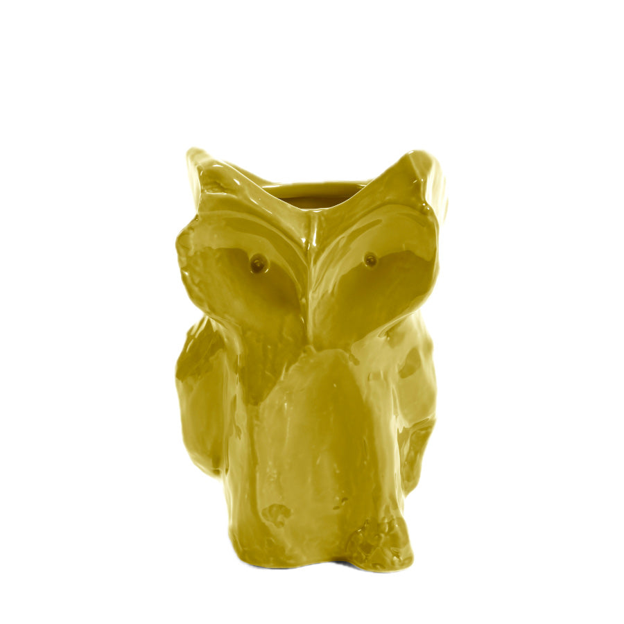 Ce vase en grès prend la forme d’un hibou stylisé et facétieux. Pas de lignes nettes ni de symétrie parfaite ici : tout est dans le jeu des volumes et l’expressivité des formes. On reconnaît les yeux creusés, le bec suggéré, les ailes fondues dans un corps tout en courbes irrégulières. Le tout est sublimé par une finition brillante, qui accentue les aspérités de la matière et donne à chaque pièce un caractère unique.