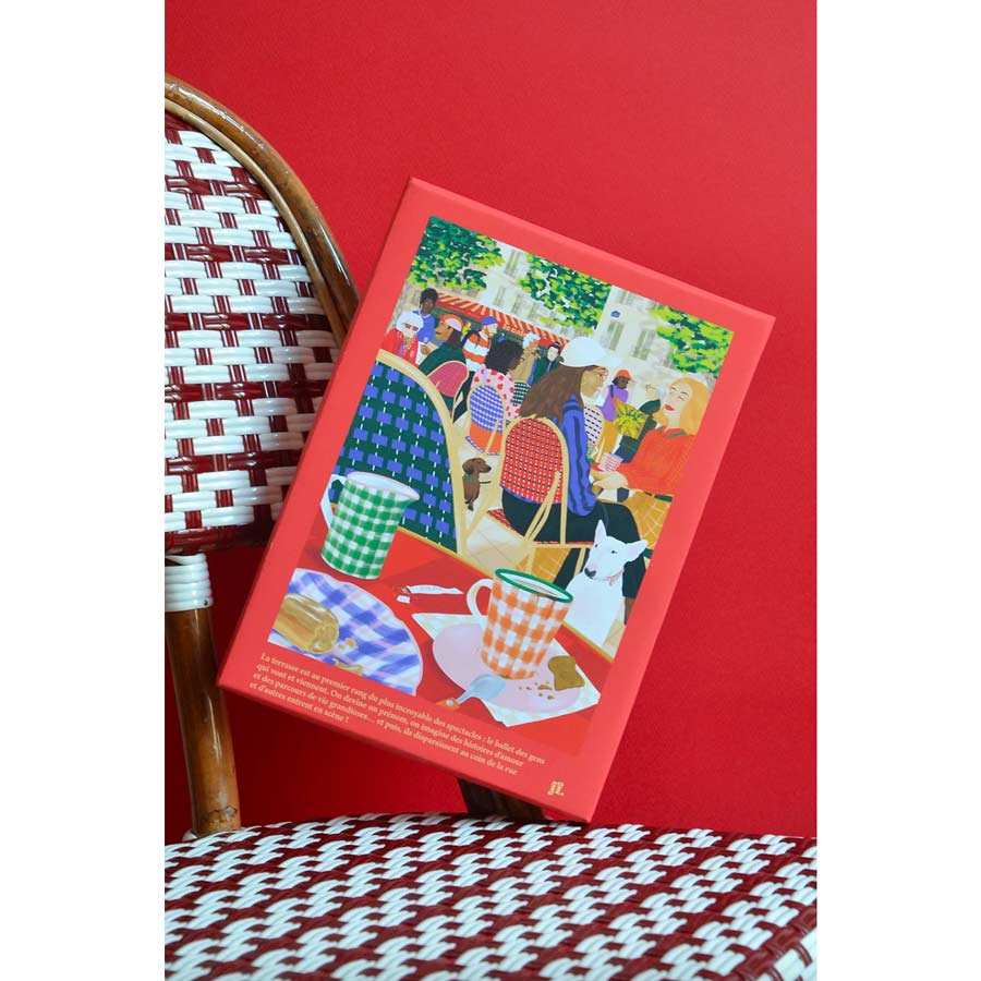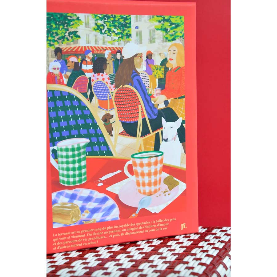 Une illustration colorée et détaillée représentant un jour de beau temps, en terrasse accompagné d'un bon café et d'un délicieux éclair. Les gens vont et viennent, ils sont joyeux, haut-en-couleurs, ils baladent leurs petits chiens et nous, on imagine leur vie ! C'est simple : on pourrait y passer des heures !