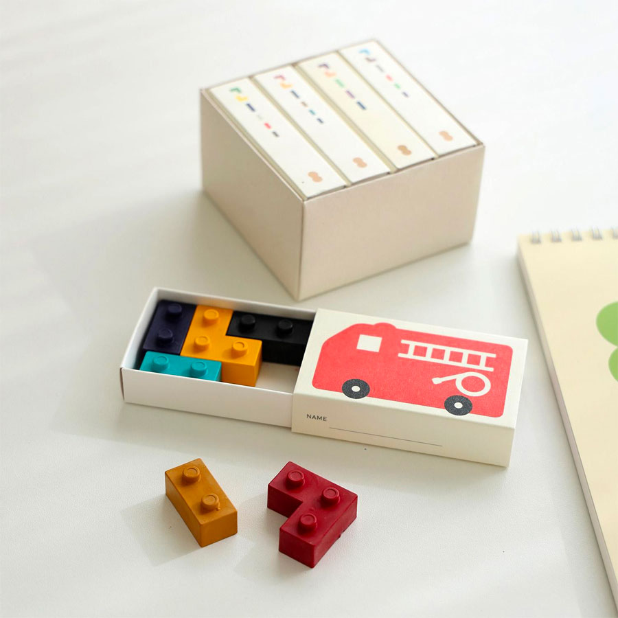 Ce set comprend six blocs de cire, répartis en trois formes différentes. Ils s’assemblent et s’empilent comme un puzzle, permettant d’appliquer plusieurs couleurs en un seul geste et de créer des effets graphiques uniques à chaque tracé. Un objet hybride, à mi-chemin entre le jeu et l’outil créatif. La cire est ferme, résistante et très couvrante. Elle glisse facilement sur le papier, s’use lentement et garde sa forme.