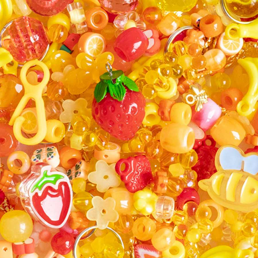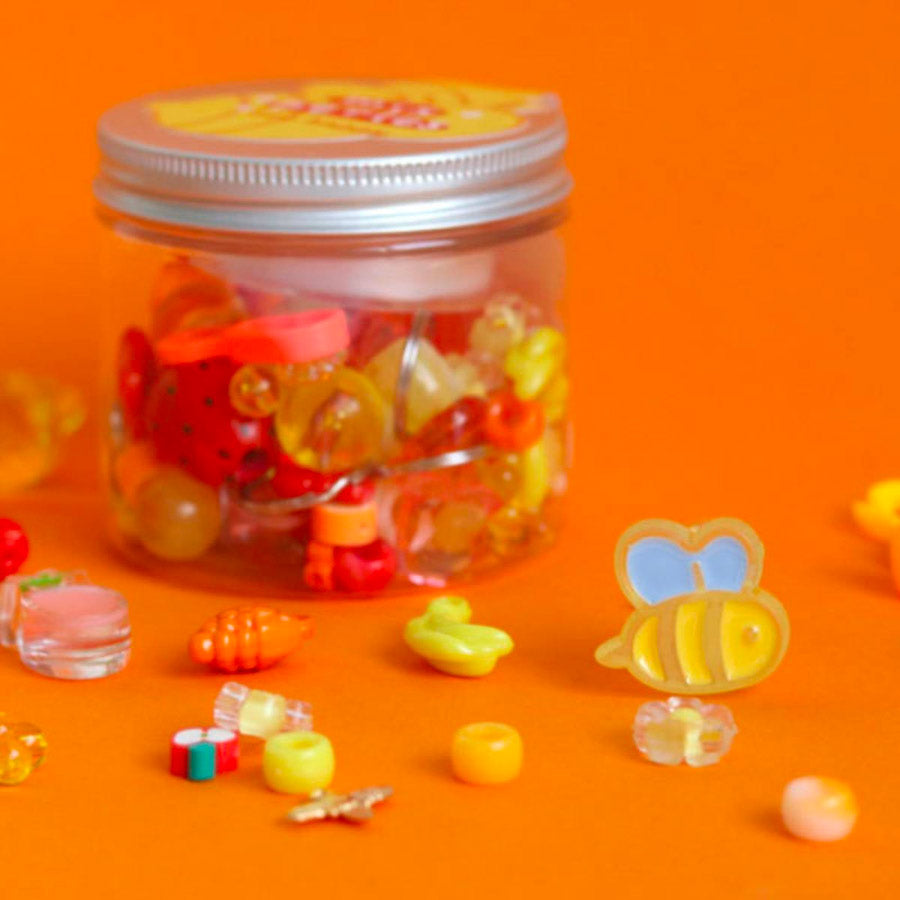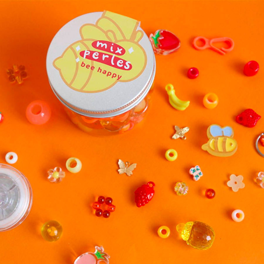 - Mix de perles Be Happy : Dans les tons jaunes et oranges, cet assortiment de perles vous plongera dans l'univers des abeilles. Des fruits, des abeilles, des papillons pour créer des bijoux fantaisies rigolos et colorés.
