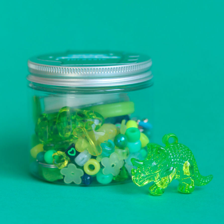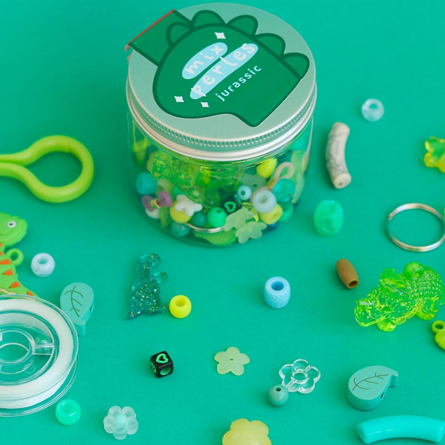 - Mix de perles Jurassic : Dans les tons verts et jaunes, ce mélange de perles vous plongera dans le monde merveilleux des dinosaures. Avec des breloques dinosaures, vous pourez créer les bijoux fantaisies que vous voulez.