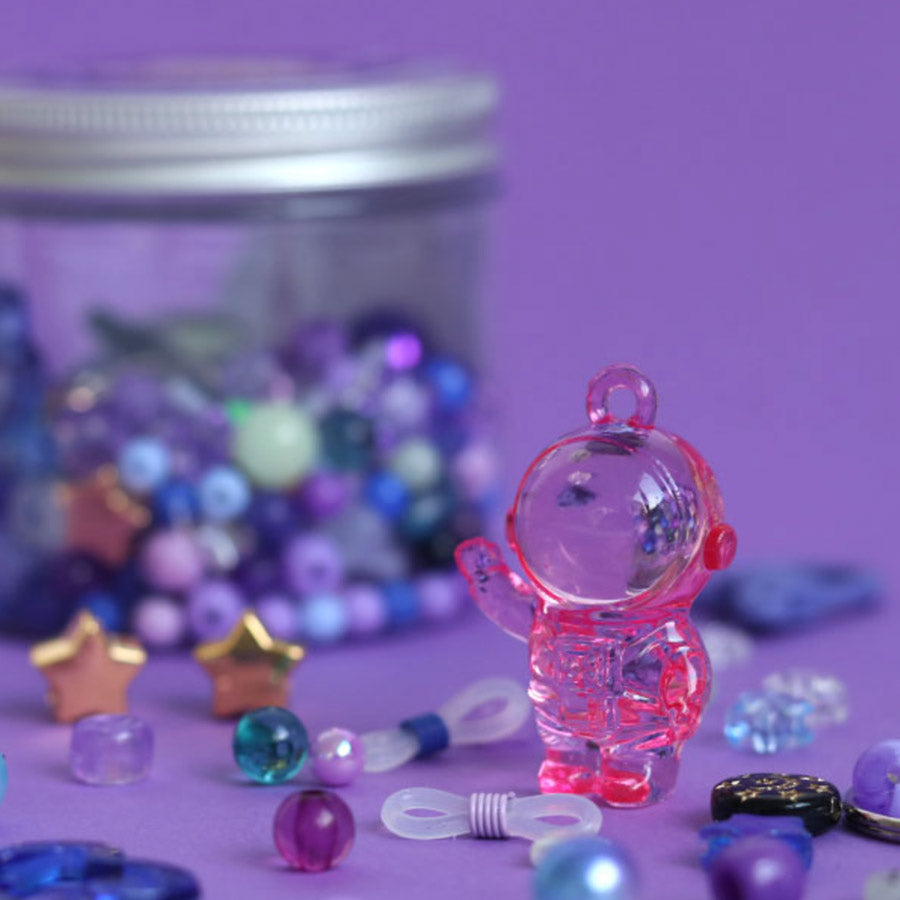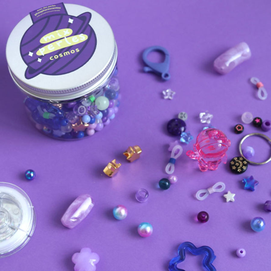 Mix de perles Cosmos : explorez un univers galactique avec ce mélange aux couleurs bleus et violets. Vous y trouverez des étoiles, des perles marbrés, des perles cosmonautes et même des perles phosphorescentes.