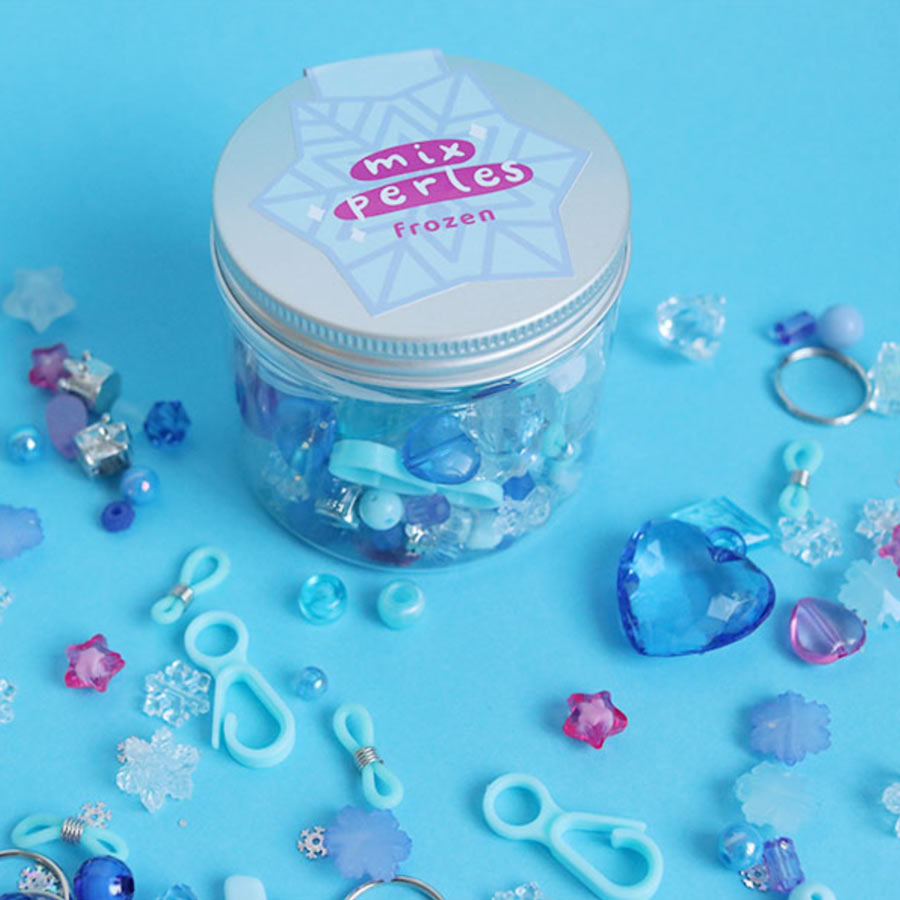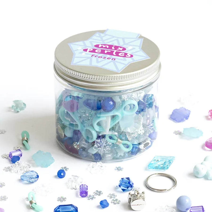 Mix de perles Frozen : Craquez pour cet assortiment inspiré de l'hiver et du célèbre dessin animé La reine des neiges. Vous y trouverez des perles dans les tons blancs et bleus. Tout un univers de glace et de flocons à découvrir. Ce mélange contient des perles pailletées, des flocons, des perles en forme de pierres précieuses et aussi des perles XXL. De quoi créer de beaux bijoux et colliers comme Elsa.