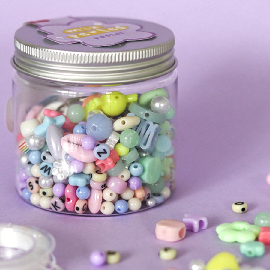 Mix de perles Pastel : Ce mélange est composé d'un ensemble de perles fantaisies aux couleurs pastels. Vous y retrouverez des perles rondes, des perles lettres, des perles avec de jolies formes : coeurs, étoiles, bonbons, fleurs. Vous pourrez ainsi créer de jolis bijoux aux teintes pastels.
