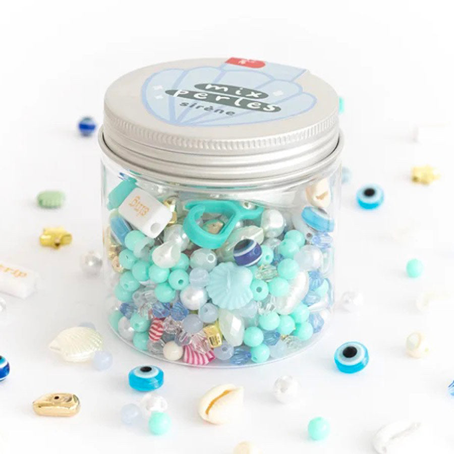 Mix de perles Sirène : plongez dans un univers aquatique avec ce mix composées de perles aux tons bleus, blancs et nacrés. Vous y retrouverez des perles en forme de coquillages, de lettres et même des perles nacrées. Ce mix est un trésor inspiré de l'océan. Idéal pour se créer de jolis bijoux à porter cet été.