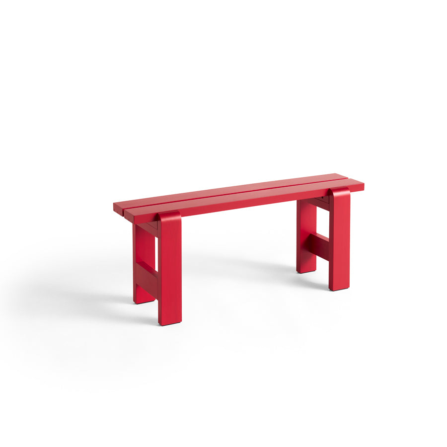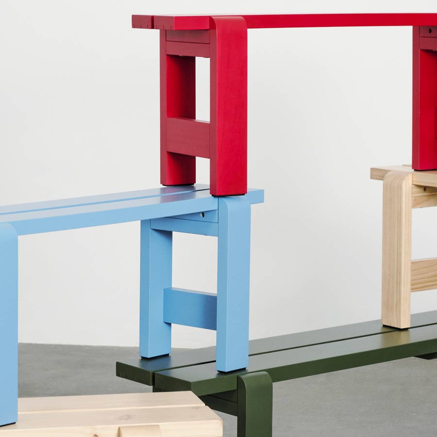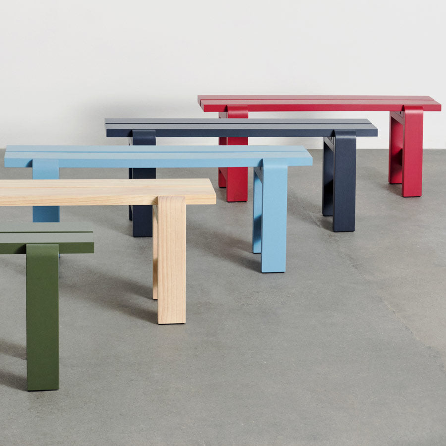 Le banc Weekday des designers Hannes Breuer et Fritz Gräber pour la marque Hay. La collection Weekday s’inspire de l’envie de réunir des personnes pour partager un repas ou un moment ensemble. Solide, ce banc se démarque par sa combinaison de pieds massifs, de ses joints arrondis et de sa fine assise.