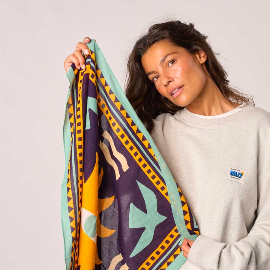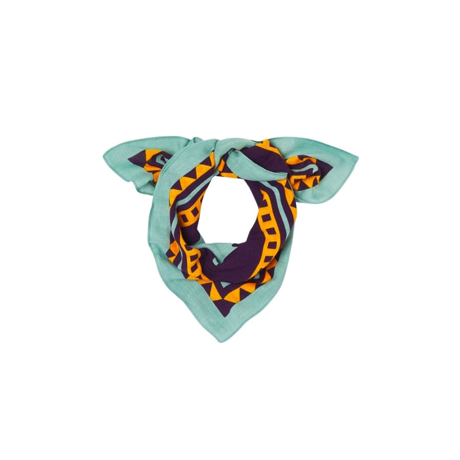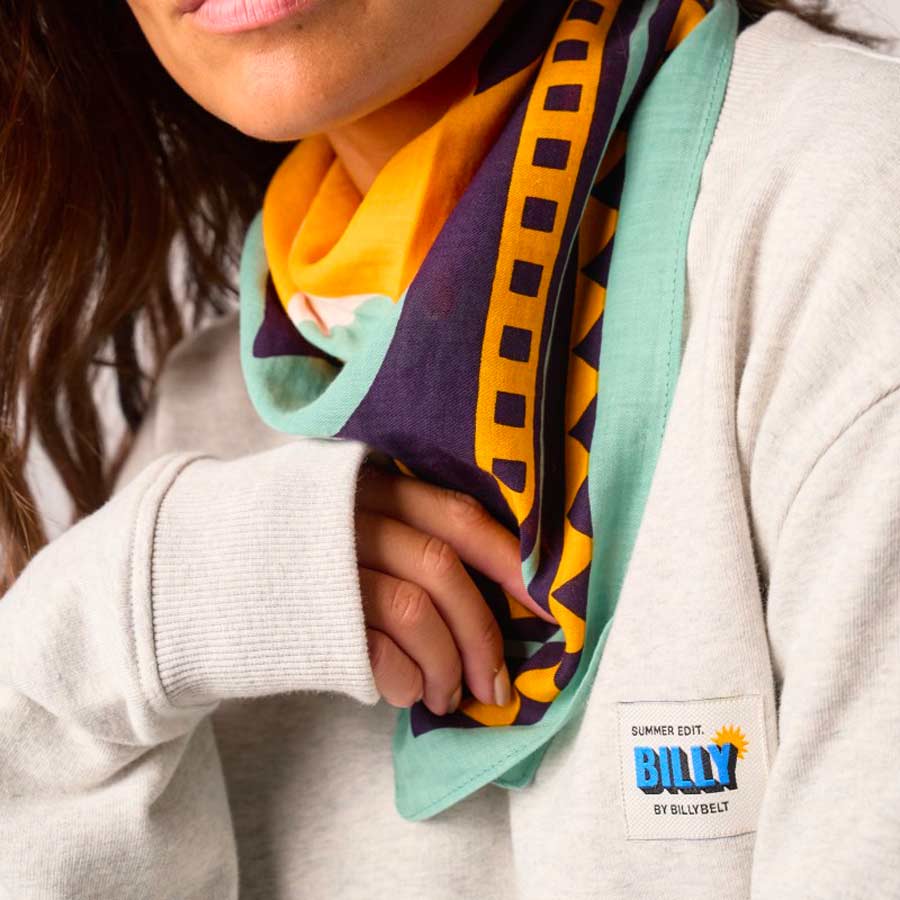Le foulard Paola violet de Billybelt mise sur une association de couleurs vibrantes : violet, turquoise et jaune. Un mix audacieux mais hyper bien équilibré, parfait pour réveiller une tenue un peu sage.