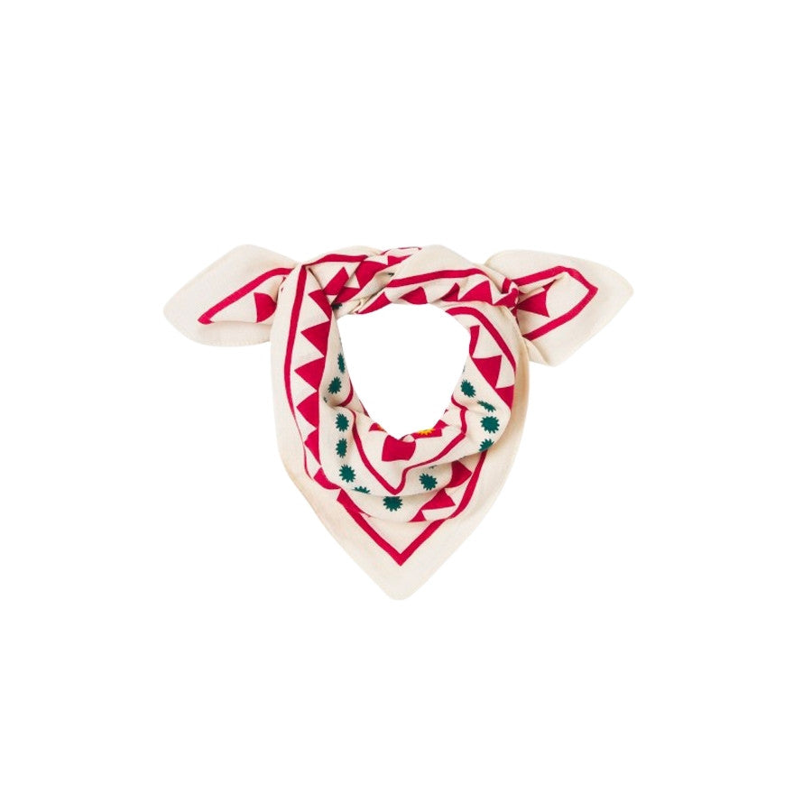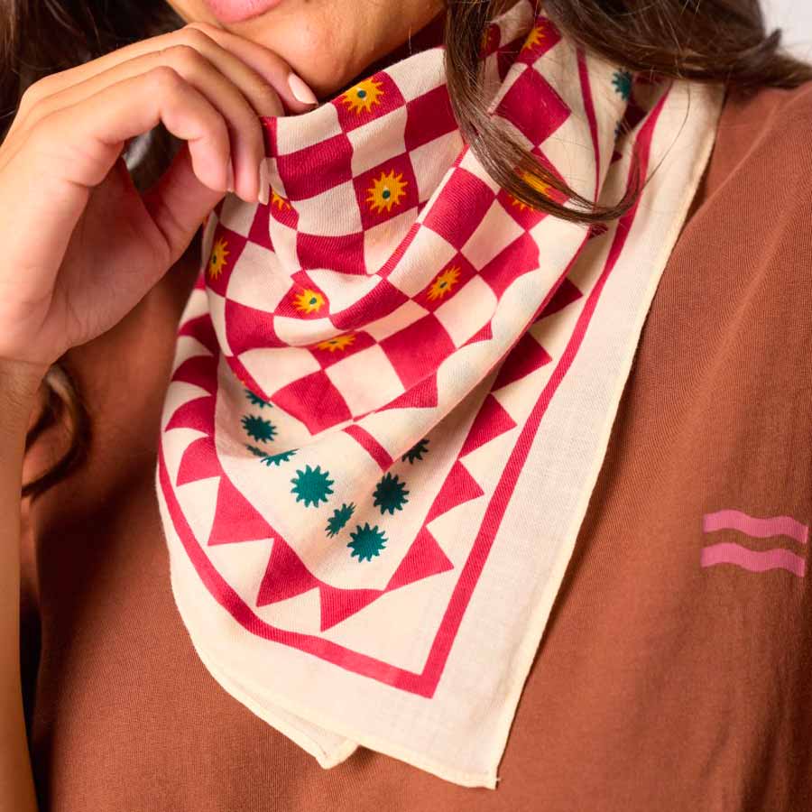 Le foulard Romane écru de Billybelt joue sur un imprimé graphique délicat mêlant écru, rouge et vert. Une palette douce mais contrastée, parfaite pour rehausser une tenue sans en faire trop.