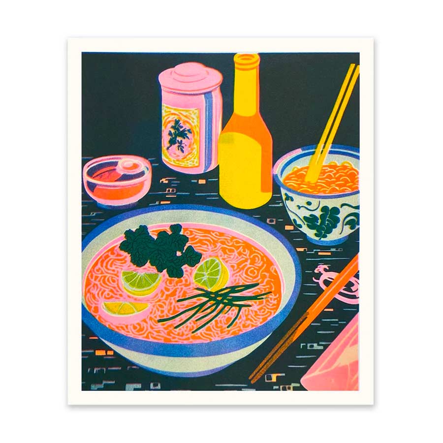 Une table dressée, des bols de ramen, des condiments qui brillent sous la lumière… et cette palette fluo qui donne à la scène un côté nocturne. L’affiche Black Ramen capture l’ambiance d’un dîner improvisé et réconfortant, avec une touche très graphique. Une vraie pépite pour les amateurs de cuisine asiatique et d’illustrations colorées !