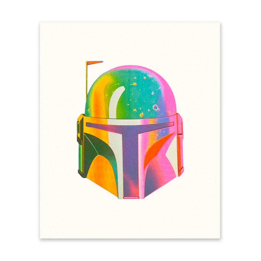 Un casque mythique revisité dans une palette fluo, avec des dégradés galactiques et un grain riso qui lui donne encore plus de relief. Une icône de la science-fiction transformée en œuvre pop.