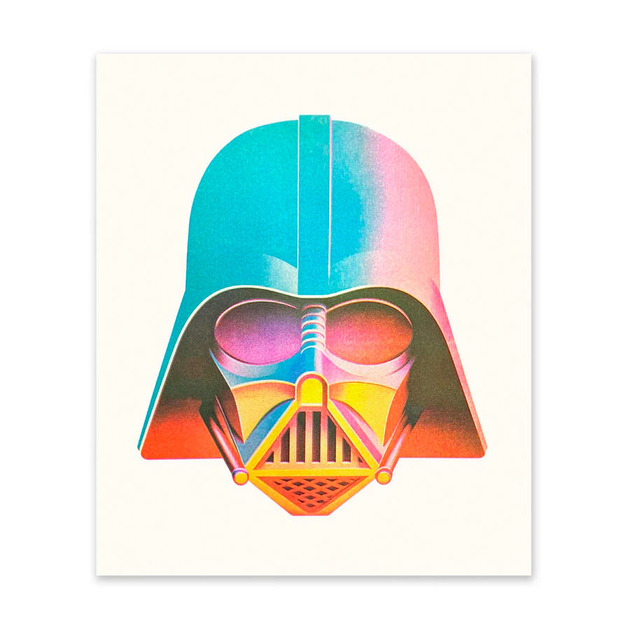 Dark Vador comme vous ne l’avez jamais vu : son casque culte transformé en icône pop ultra colorée, entre néon et dégradé. On adore le contraste entre le personnage sombre et cette explosion de couleurs fluo.