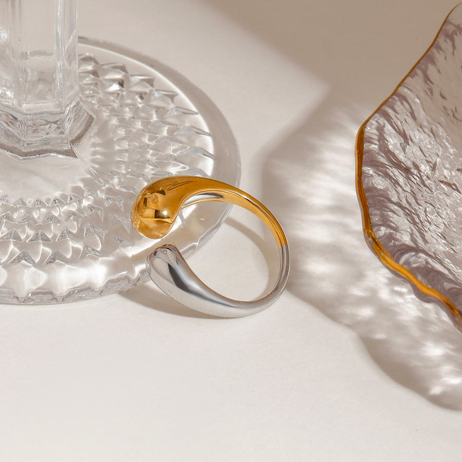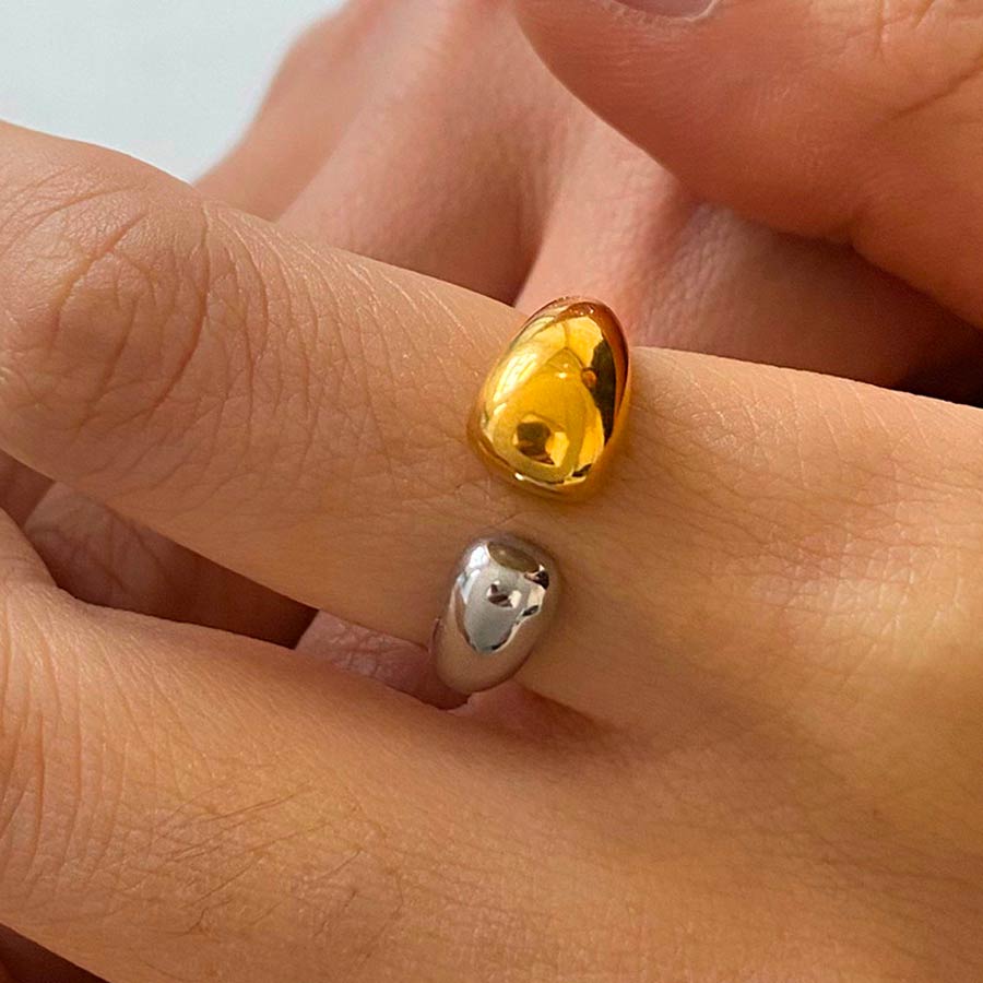 Discrète, moderne, originale : cette bague ouverte joue sur les contrastes avec ses deux extrémités dorée et argentée. Un design épuré, facile à porter, qui fait toujours son petit effet.