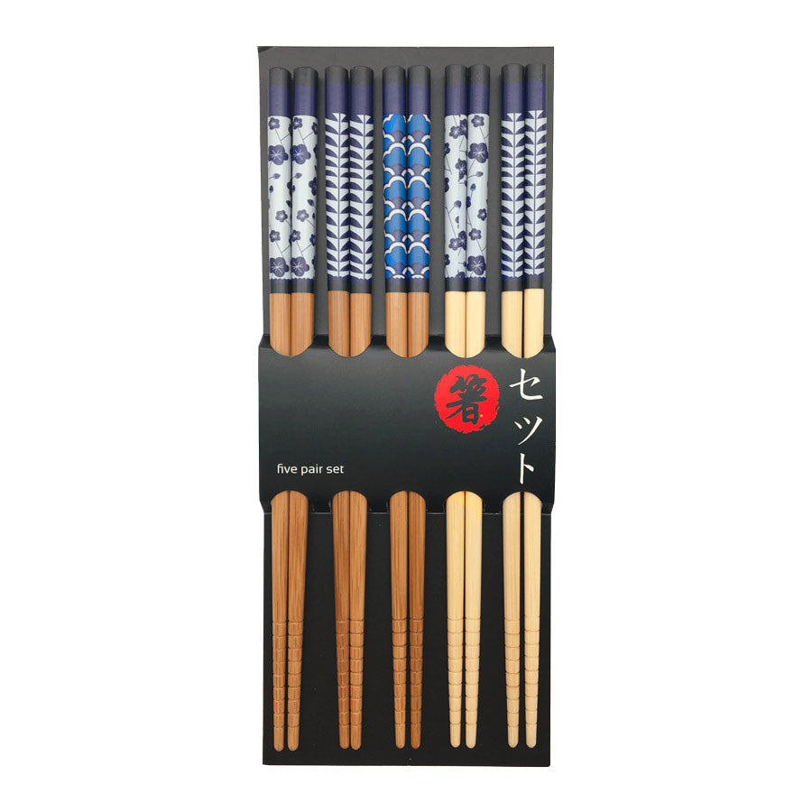 On retrouve trois paires de baguettes en bois foncé et deux autres paires de couleur plus claire. Grâce aux différents jolis motifs présents sur chaque paire de baguette, chacun peut identifier facilement ses propres baguettes lors des repas.