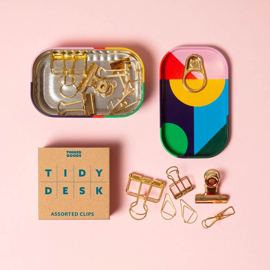 Si vous aimez que votre bureau soit aussi stylé que bien rangé, la boîte Tidy Desk est faite pour vous. À l’intérieur de ce packaging en métal hyper colorée, façon boîte de conserve, vous trouverez un mélange de trombones et pinces dorées, aussi pratiques que beaux. De quoi garder vos papiers en ordre avec une touche de chic.