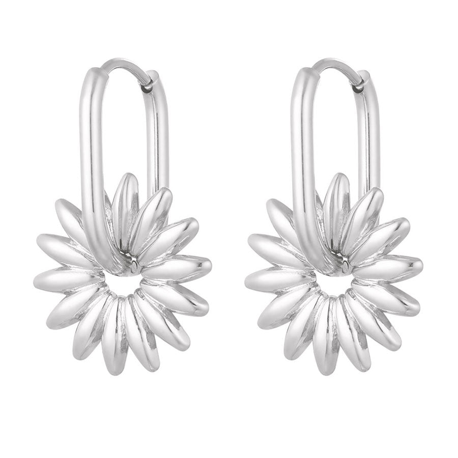 Découvrez ces adorables boucles d'oreilles allongées argentées. Ornées d'une délicate fleur sur le dessus, elles sont idéales pour une occasion festive ou pour le quotidien. Ces boucles s'accordent facilement avec divers bijoux pour créer un look stylé.
