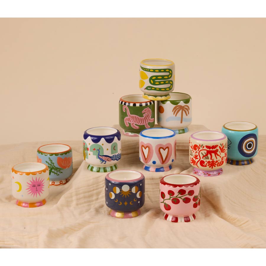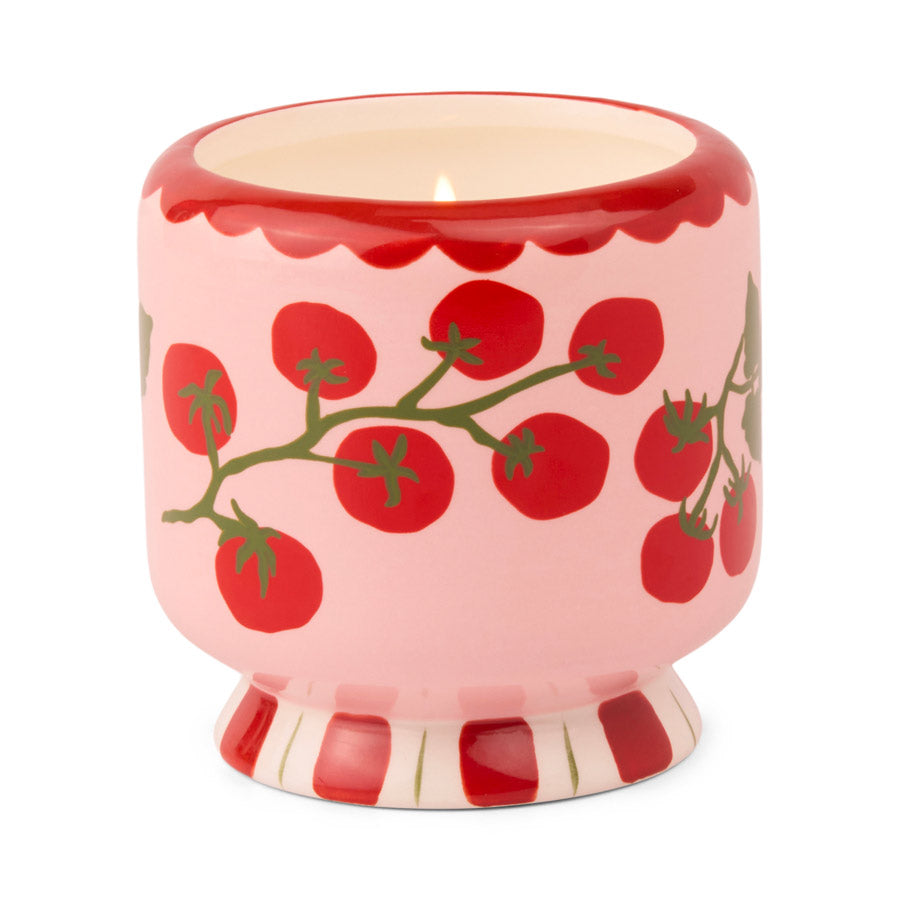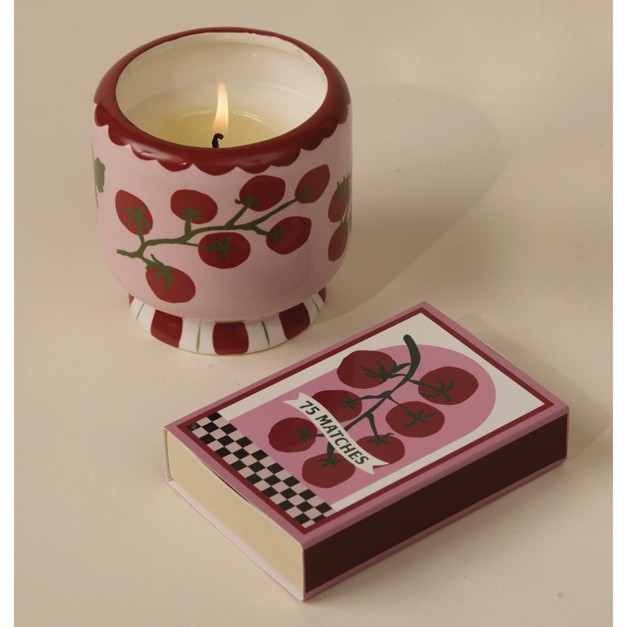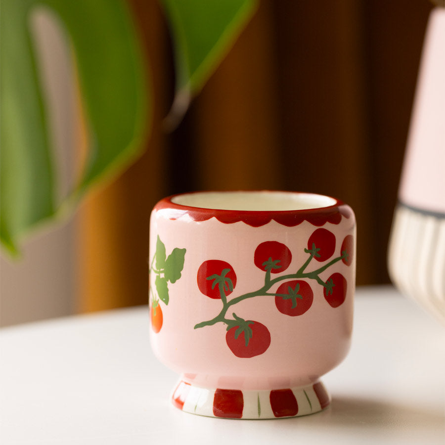 Cette bougie en céramique, au design pop et ludique, présente des illustrations peintes à la main de tomates, sur un fond subtilement rosée.