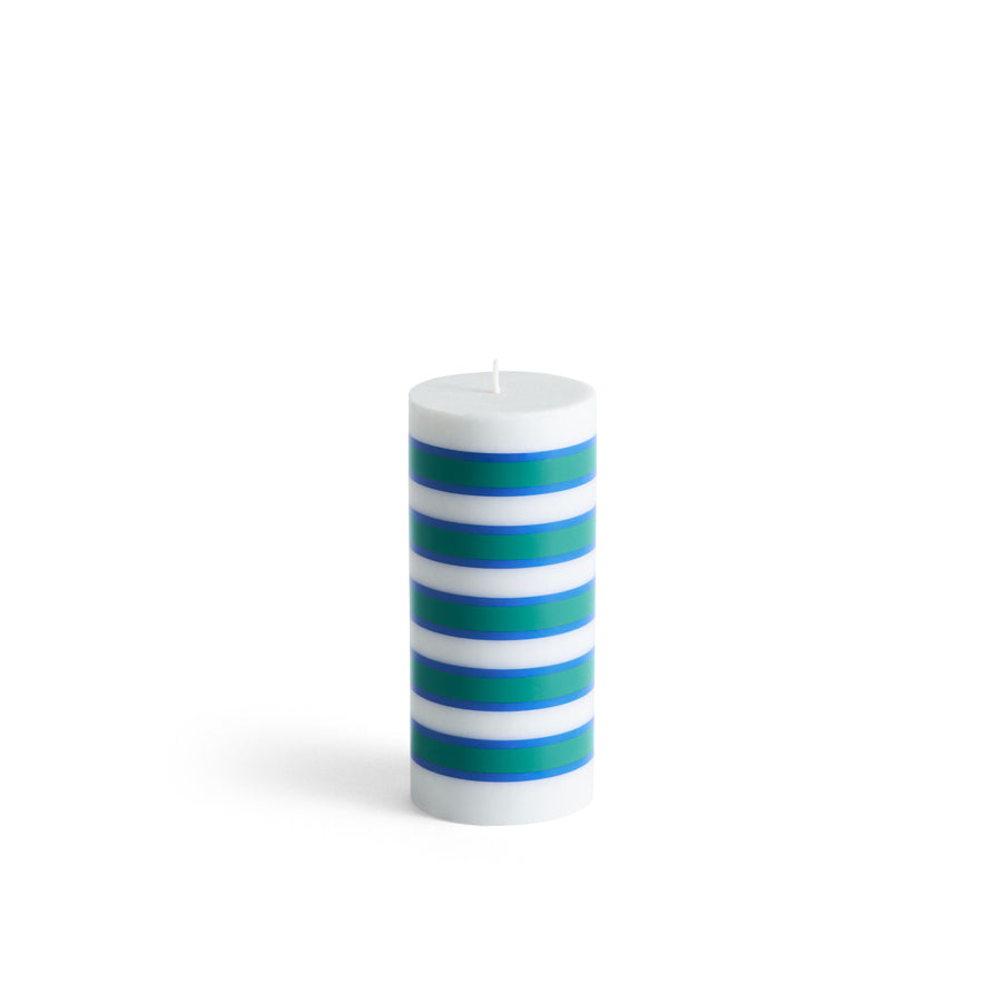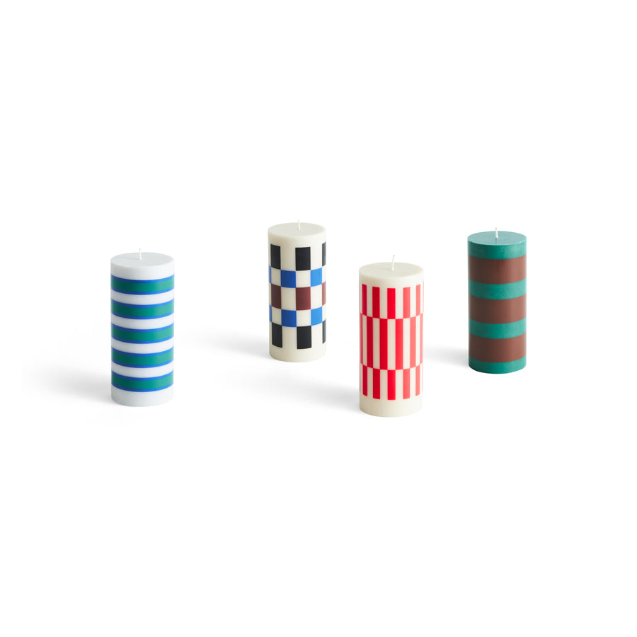 La bougie Column taille S, gris clair, bleu et vert de chez Hay. Avec sa forme simple et ses graphismes colorés, cette bougie apporte une touche design à votre intérieur. De grand diamètre, cette bougie colonne est certifiée par l'Ecolabel Nordic Swan. Cette bougie convient pour le Bougeoir Column taille S.