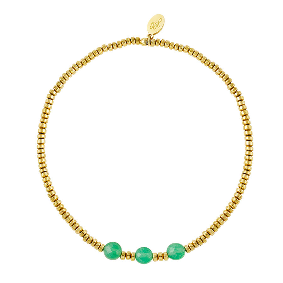 Qu'il est joli, ce bracelet de perles dorées avec trois grosses pierres vertes au centre ! Subtilement accrocheur, il se combine parfaitement avec d'autres bracelets pour un look superposé tendance.